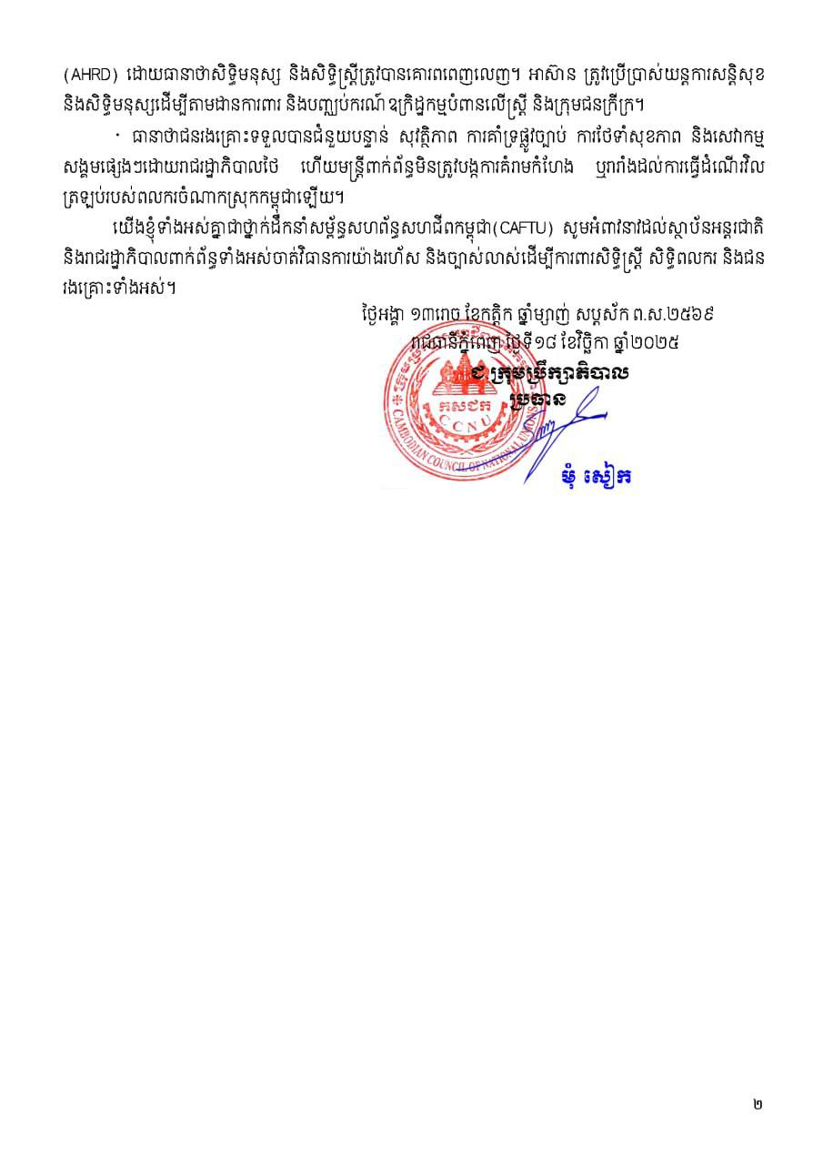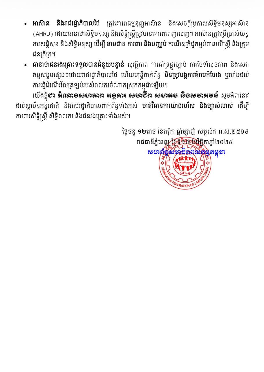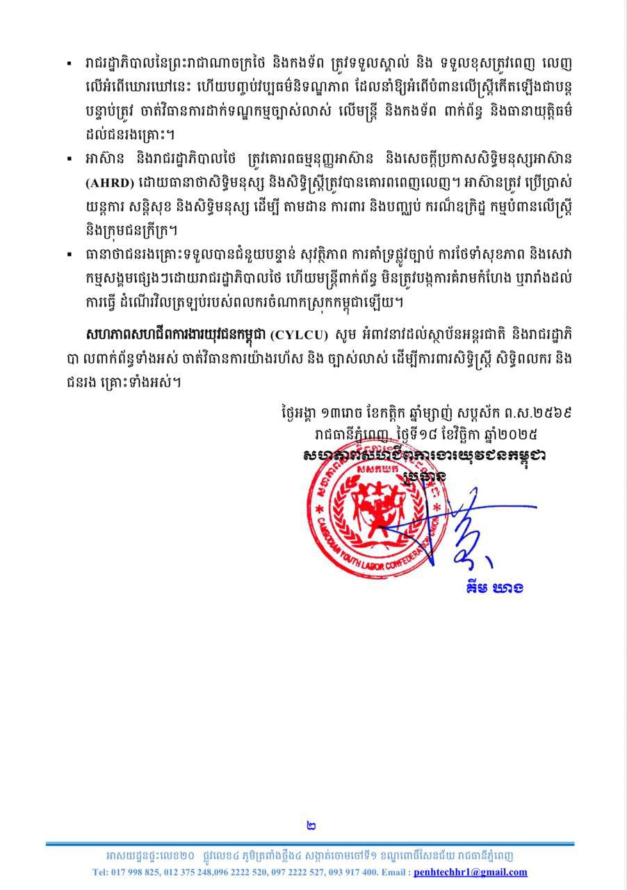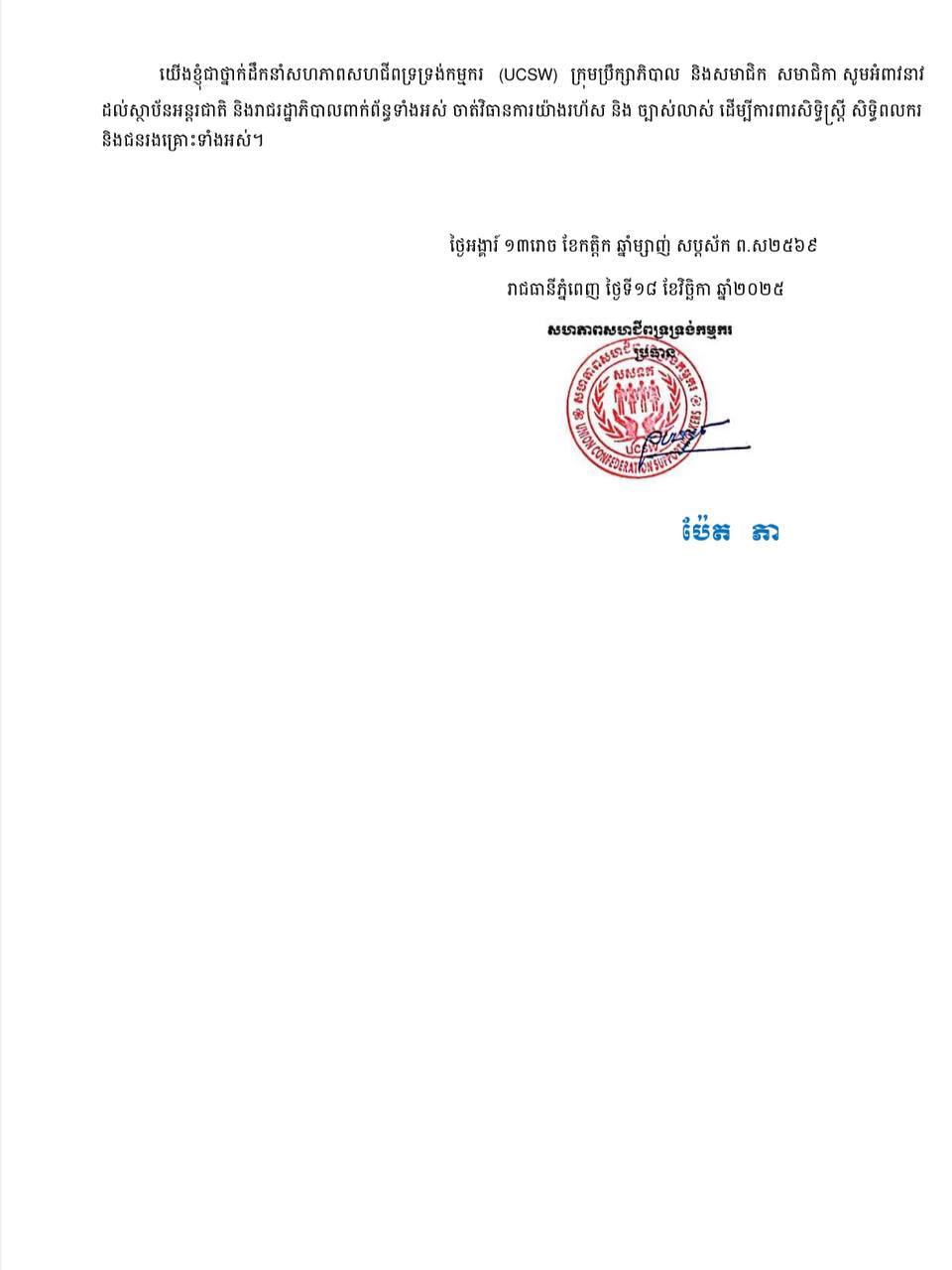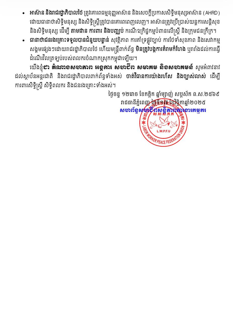 រាជធានីភ្នំពេញ ៖ សហជីពនៅកម្ពុជាតំណាងឱ្យកម្មករនិយោជិតរាប់ម៉ឺននាក់ នៅថ្ងៃទី១៨ ខែវិច្ឆិកា ឆ្នាំ២០២៥នេះ បានប្រកាសថ្កោលទោសយ៉ាងដាច់អហង្ការ ចំពោះអំពើយ៉ាងសាហាវព្រៃផ្សៃ យង់ឃ្នងតិរច្ឆានគ្មានមនុស្សធម៌ របស់យោធាឈុតខ្មៅថៃ…