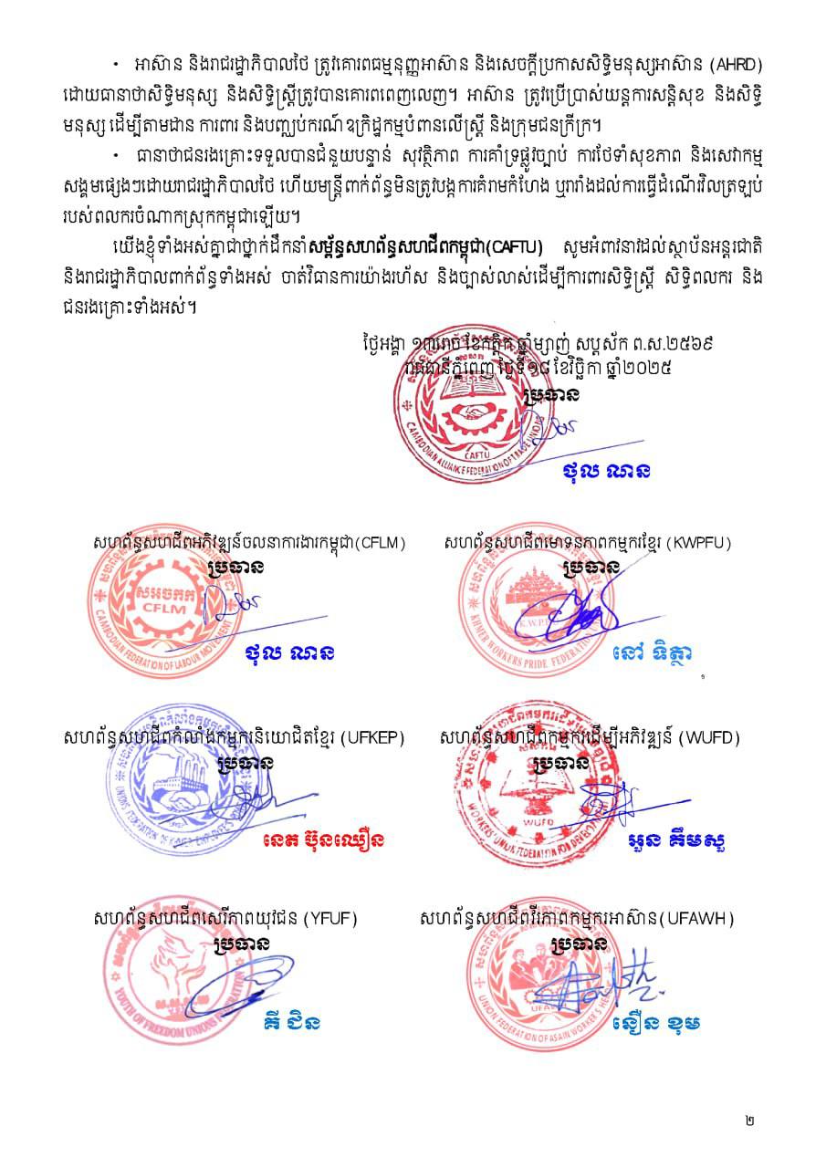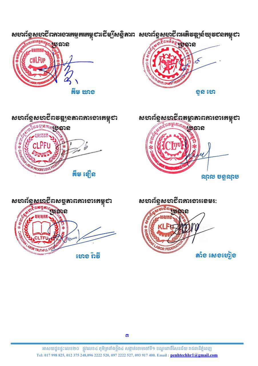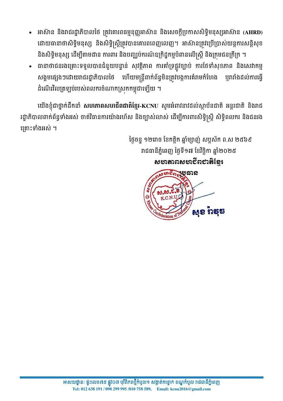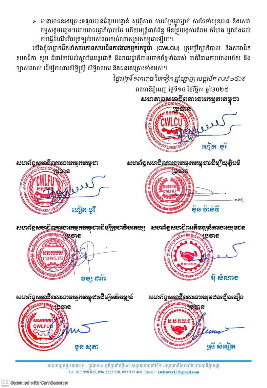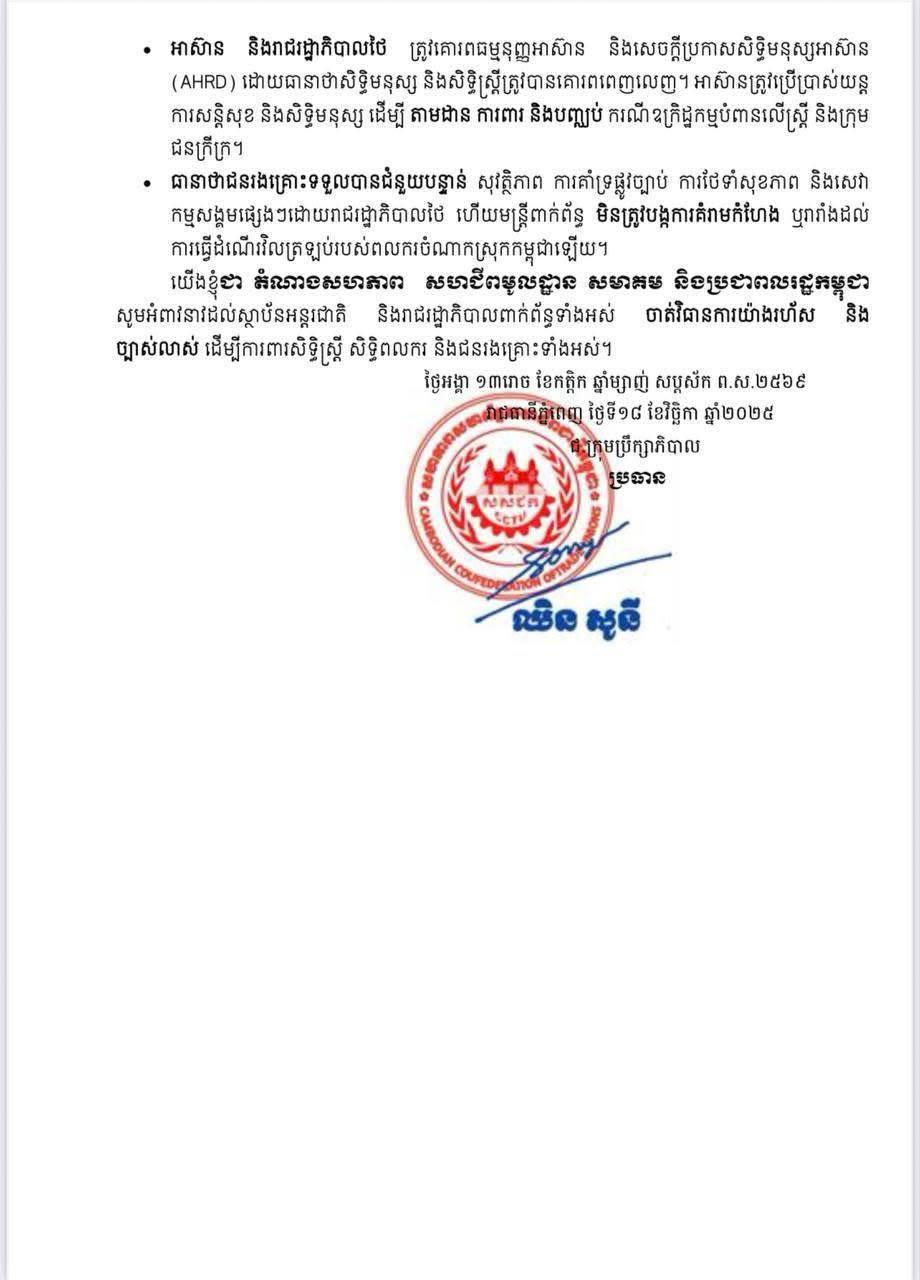 រាជធានីភ្នំពេញ ៖ សហជីពនៅកម្ពុជាតំណាងឱ្យកម្មករនិយោជិតរាប់ម៉ឺននាក់ នៅថ្ងៃទី១៨ ខែវិច្ឆិកា ឆ្នាំ២០២៥នេះ បានប្រកាសថ្កោលទោសយ៉ាងដាច់អហង្ការ ចំពោះអំពើយ៉ាងសាហាវព្រៃផ្សៃ យង់ឃ្នងតិរច្ឆានគ្មានមនុស្សធម៌ របស់យោធាឈុតខ្មៅថៃ…