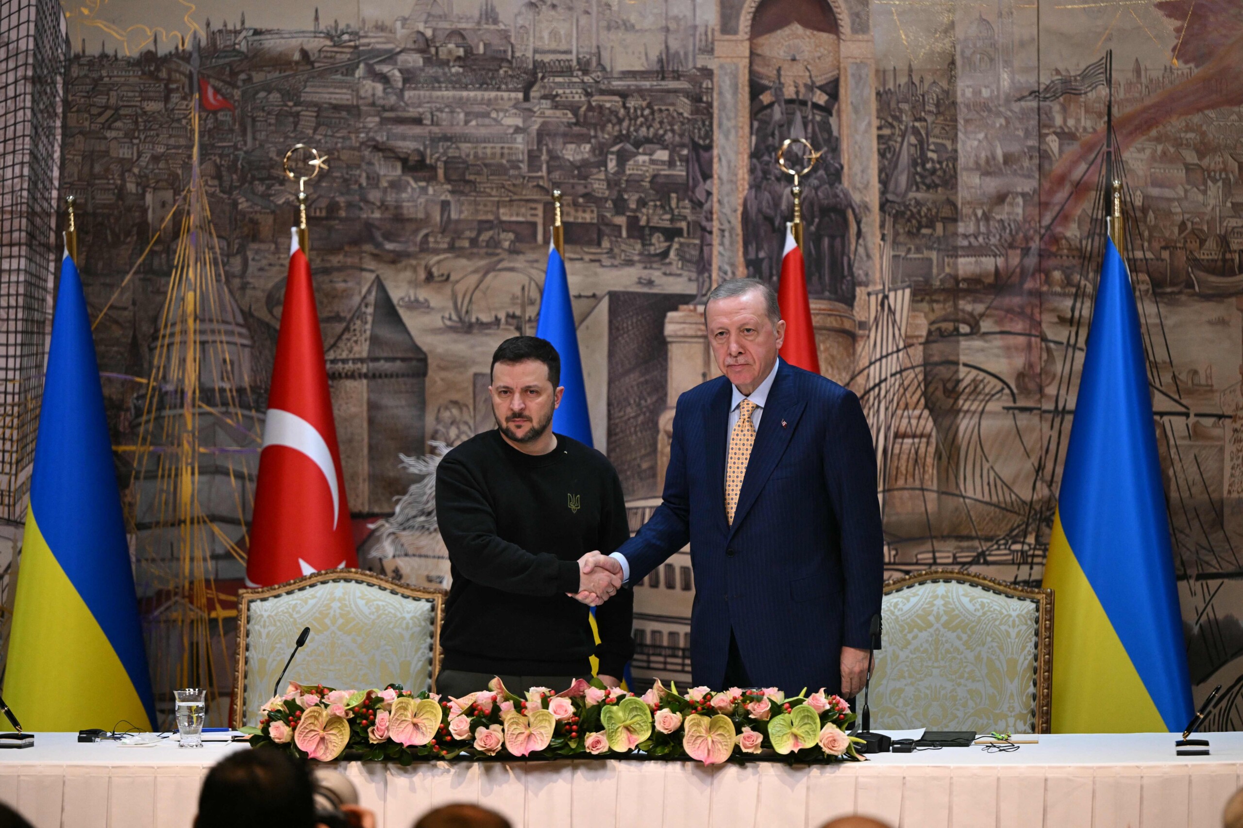 Turkish President Recep Tayyip Erdogan (R) shakes hands with Ukrainian President Volodymyr Zelensky (L) after a joint press conference at the Dolmabahce Presidental office in Istanbul on March 8, 2024. (Photo by OZAN KOSE / AFP)