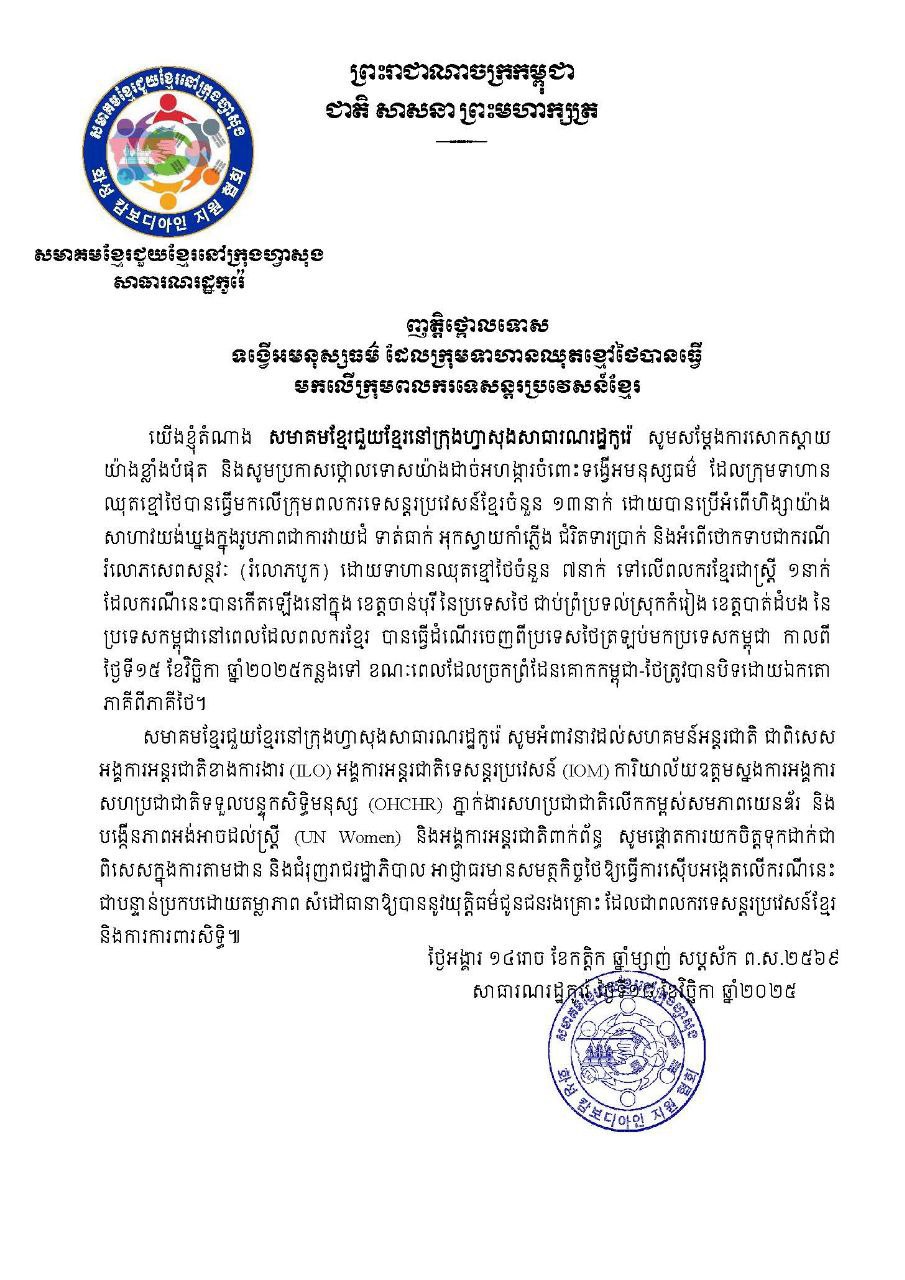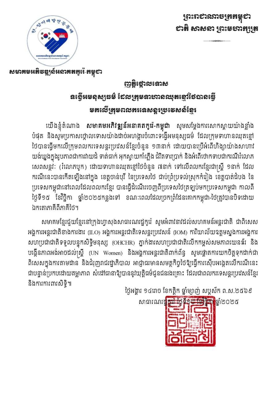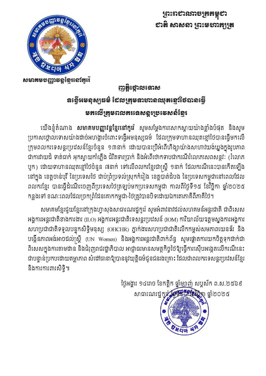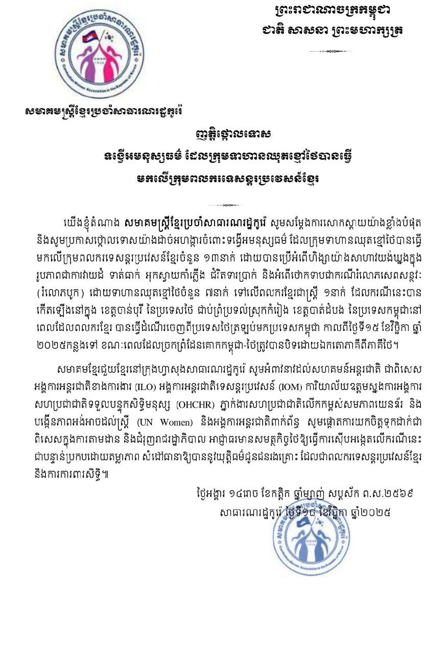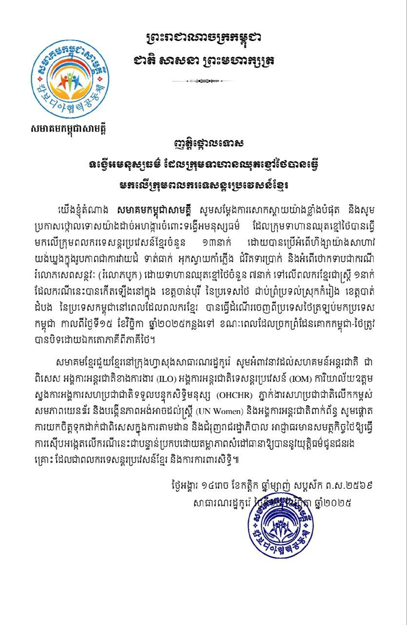 រាជធានីភ្នំពេញ ៖ សមាគមខ្មែរចំនួន៦ នៅរ៉េខាងត្បូង នៅថ្ងៃទី១៩ ខែវិច្ឆិកា ឆ្នាំ២០២៥នេះ បានចេញញត្តិដាច់ដោយឡែកពីគ្នាប្រកាសថ្កោលទោសយ៉ាងដាច់អហង្ការចំពោះទង្វើអមនុស្សធម៌ ដែលក្រុមទាហានឈុតខ្មៅថៃបានធ្វើមកលើក្រុមពលករទេសន្តរប្រវេសន៍ខ្មែរចំនួន ១៣នាក់ និងអំពើថោកទាបជាករណីរំលោភសេពសន្ថវៈយ៉ាងព្រៃផ្សៃ ។