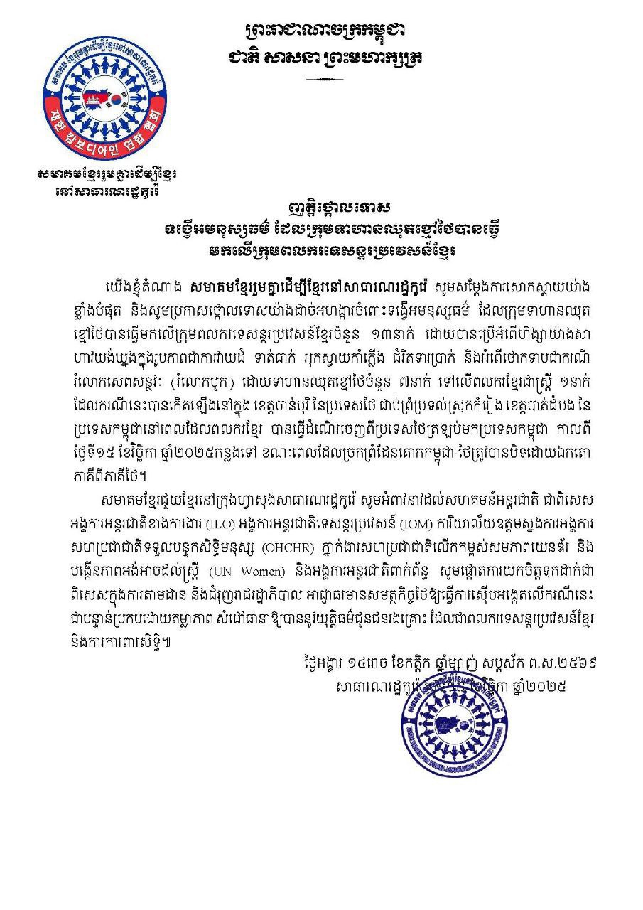 សមាគមខ្មែរនៅកូរ៉េខាងត្បូង បានអំពាវនាវដល់សហគមន៍អន្តរជាតិ ជាពិសេស អង្គការអន្តរជាតិខាងការងារ (ILO) អង្គការអន្តរជាតិទេសន្តរប្រវេសន៍ (IOM) ការិយាល័យឧត្តមស្នងការអង្គការសហប្រជាជាតិទទួលបន្ទុកសិទ្ធិមនុស្ស (OHCHR) ភ្នាក់ងារសហប្រជាជាតិលើកកម្ពស់សមភាពយេនឌ័រ និង បង្កើនភាពអង់អាចដល់ស្ត្រី (UN Women) និងអង្គការអន្តរជាតិពាក់ព័ន្ធ សូមផ្តោតការយកចិត្តទុកដាក់ ជាពិសេស ក្នុងការតាមដាននិងជំរុញរាជរដ្ឋាភិបាល អាជ្ញាធរមានសមត្ថកិច្ចថៃឱ្យធ្វើការស៊ើបអង្កេតលើករណីនេះ ជាបន្ទាន់ប្រកបដោយតម្លាភាព សំដៅធានាឱ្យបាននូវយុត្តិធម៌ជូនជនរងគ្រោះ ដែលជាពលករទេសន្តរប្រវេសន៍ខ្មែរ និងការការពារសិទ្ធិ ៕ អត្ថបទសហការ