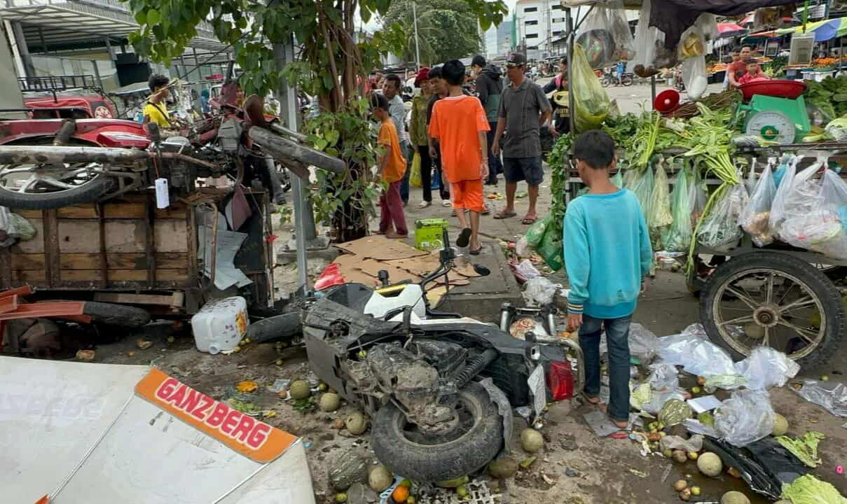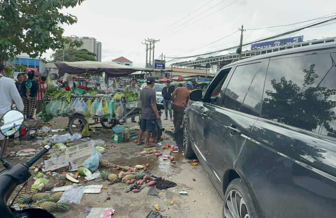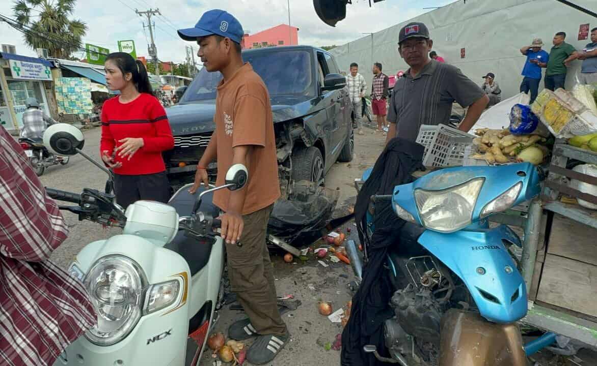 រាជធានីភ្នំពេញ ៖ រថយន្តម៉ាកRANG ROVER មួយគ្រឿង បានបើកបោះពួយក្នុងល្បឿនក៏ជ្រុលទៅបុករះរ៉ឺម៉កម៉ូតូលក់បន្លែ ផ្លែឈើនៅតាមដងផ្លូវ និងម៉ូតូបន្តបន្ទាប់បណ្ដាលឱ្យអ្នកលក់ដូរ និងអ្នកចូលផ្សាររងរបួសធ្ងន់និងស្រាលចំនួន៥នាក់ ។