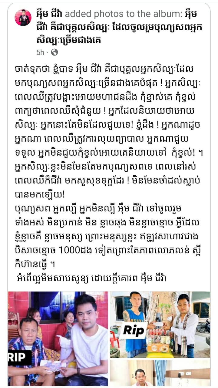 តាមរយៈសំណេរដែលបង្ហោះលើបណ្តាញសង្គមលោក អ៊ឹម ជីវ៉ា បានលើកឡើងថា ចាត់ទុកថា ខ្ញុំបាទ អ៊ឹម ជីវ៉ា គឺជាបុគ្គលអ្នកសិល្បៈដែលមកបុណ្យសពអ្នកសិល្បៈច្រើនជាងគេបំផុត ! អ្នកសិល្បៈពេលឈឺត្រូវបង្ហាះអោយមហាជនដឹង កុំខ្មាស់គេ កុំខ្វល់ពាក្យថាពេលឈឺសុំជំនួយ ! អ្នកដែលនិយាយថាអោយសិល្បៈ អ្នកនោះគែមិនដែលជួយទេ! ។