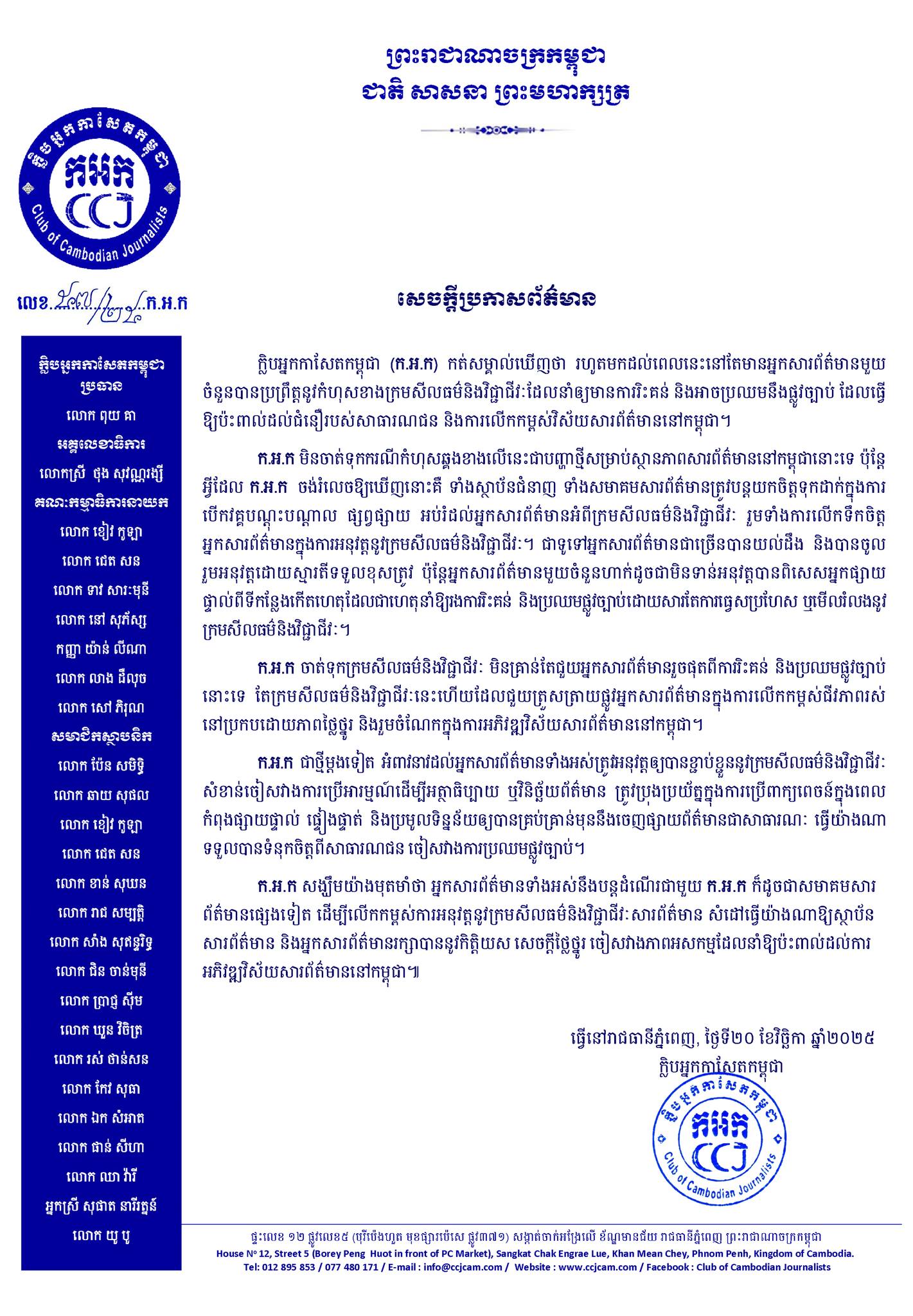 រាជធានីភ្នំពេញ ៖ ក្លិបអ្នកកាសែតកម្ពុជា (ក.អ.ក) កត់សម្គាល់ឃើញថា រហូតមកដល់ពេលនេះ នៅតែមានអ្នកសារព័ត៌មានមួយចំនួន បានប្រព្រឹត្តនូវកំហុសខាងក្រមសីលធម៌ និងវិជ្ជាជីវៈ ដែលនាំឲ្យមានការរិះគន់ និងអាចប្រឈមនឹងផ្លូវច្បាប់ ដែលធ្វើឱ្យប៉ះពាល់ដល់ជំនឿរបស់សាធារណជន និងការលើកកម្ពស់វិស័យសារព័ត៌មាន នៅកម្ពុជា ។