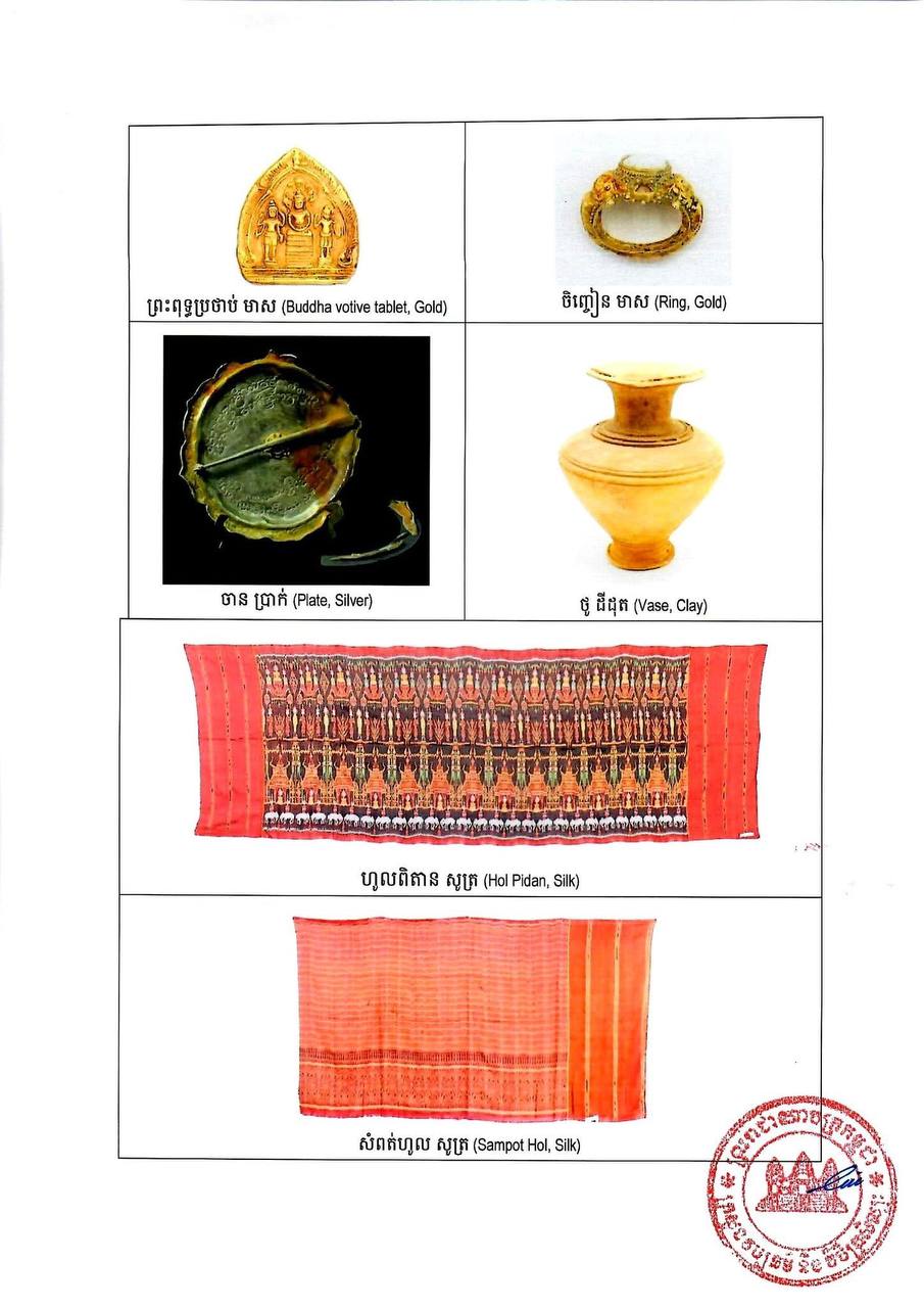 ក្រសួងវប្បធម៌បានឱ្យដឹងដែរថា ក្នុងចំណោមវត្ថុសិល្បៈខ្មែរសំខាន់ៗ ដែលបានព្រមព្រៀងប្រគល់មកកម្ពុជាវិញនាពេលនេះមានជាអាទិ៍៖ វាយនភណ្ឌសូត្រខ្មែរចំនួន១៨៣ផ្ទាំង ដែលជាគំរូសូត្រខ្មែរដ៏ល្អពិចិត្រមួយ សម្រាប់សមុច្ច័យវាយនភណ្ឌរបស់សារមន្ទីរជាតិកម្ពុជា និងវត្ថុសម័យបុរេប្រវត្តិសាស្ត្រ ដូចជា កាក់ អង្កាំ គ្រឿងអលង្ការ និងវត្ថុប្រើប្រាស់ធ្វើពីលោហៈធាតុមានតម្លៃ សំរិទ្ធ ថ្ម និងដីដុត ដែលភាគច្រើនត្រូវបានលួចនាំចេញពីកម្ពុជា ក្នុងអំឡុងសម័យសង្គ្រាមស៊ីវិលច្រើនទសវត្សរ៍កន្លងទៅ។ ក្នុងនោះដែរ ក៏មានសមុច្ច័យសំខាន់ៗមួយចំនួនទៀតដូចជា វត្ថុធ្វើពីថ្ម និងសំរិទ្ធ ក្នុងសម័យមុនអង្គរ និងសម័យអង្គរ។