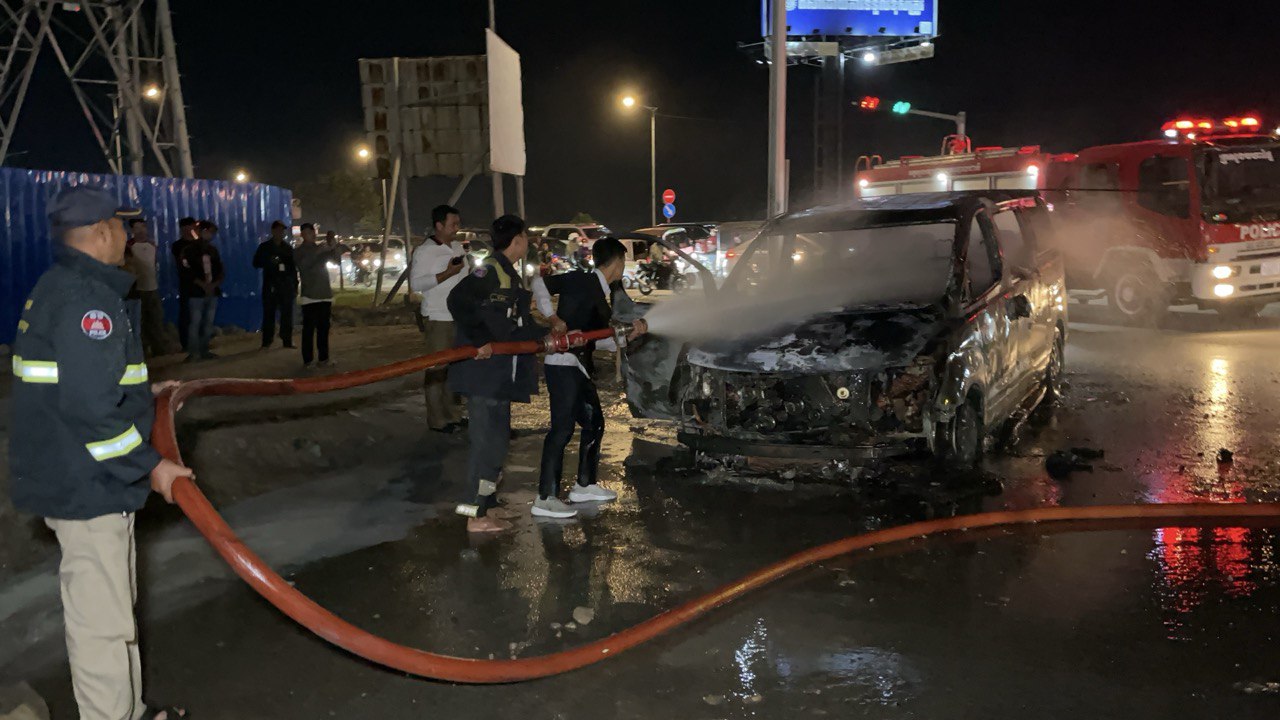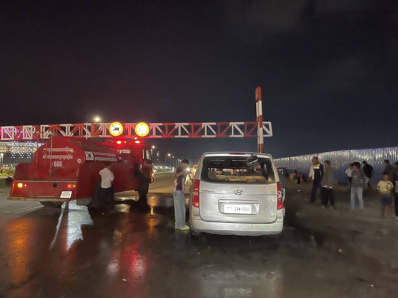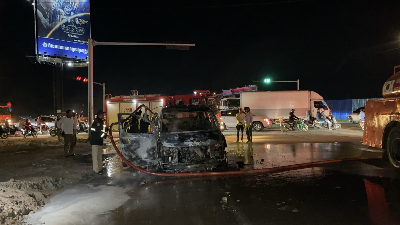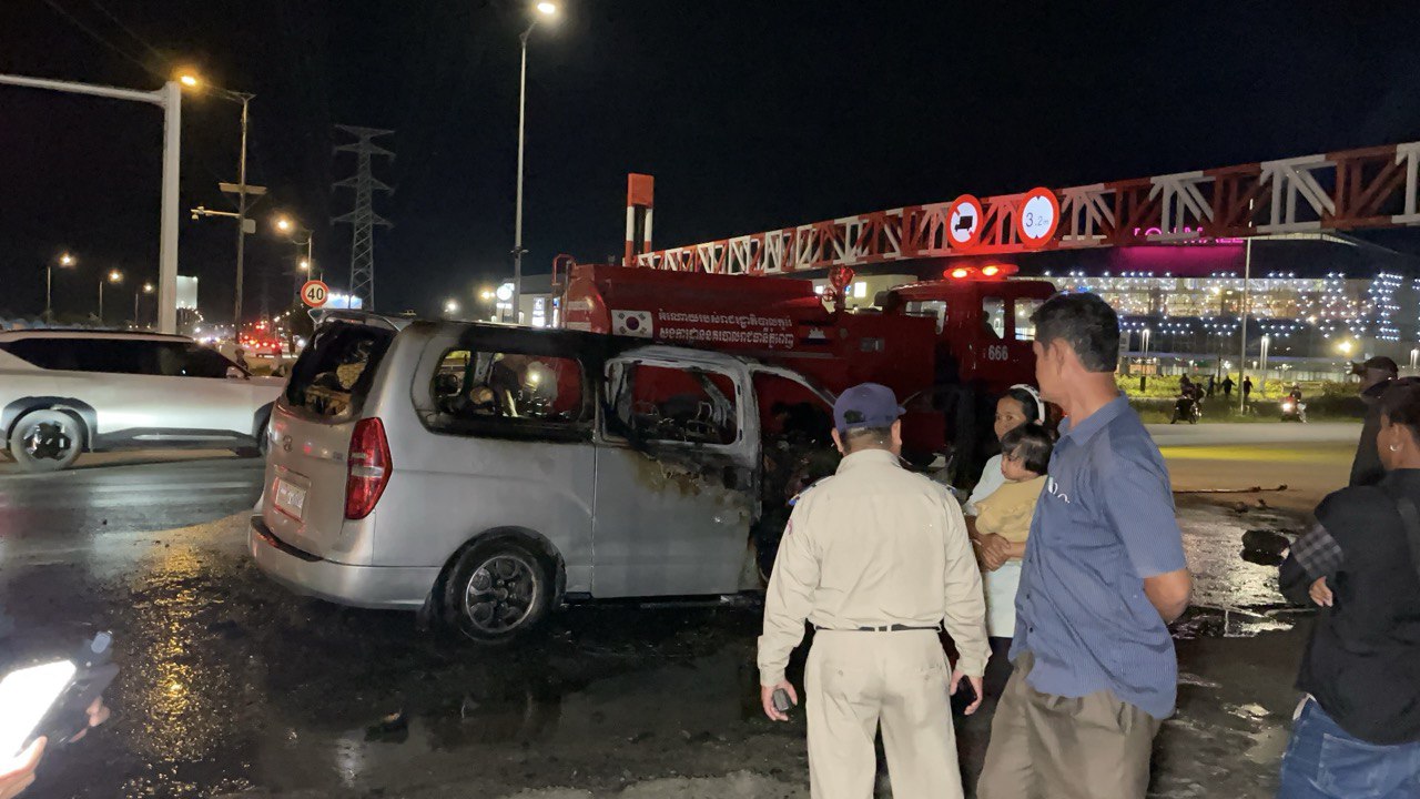 រាជធានីភ្នំពេញ ៖ រថយន្តមួយគ្រឿង Hyundai Starex ជិះជាលក្ខណៈគ្រួសារសុខៗ ស្រាប់តែឆ្លងចរន្តបង្កជាអណ្តាតភ្លើងឆាបឆេះយ៉ាងសន្ធោសន្ធៅ ផ្អើលប្រជាពលរដ្ឋនិងសមត្ថកិច្ចចេញរថយន្តពន្លត់អគ្គីភ័យអន្តរាគមន៍បាញ់ពន្លត់ កាលពីវេលាម៉ោង៦និង១៥នាទីយប់ថ្ងៃទី២០ ខែវិច្ឆិកា…