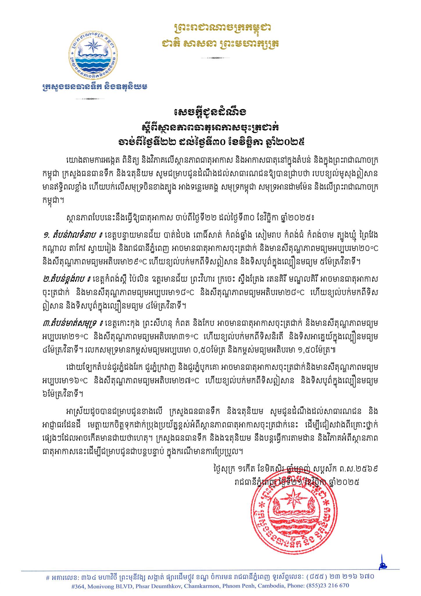 យោងតាមសេចក្តីជូនដំណឹងរបស់ក្រសួងធនធានទឹក នៅថ្ងៃទី២១ វិច្ឆិកា ឆ្នាំ២០២៥ ស្តីពីស្ថានភាពធាតុអាកាសចុះត្រជាក់ ចាប់ពីថ្ងៃទី២២ ដល់ថ្ងៃទី៣០ ខែវិច្ឆិកា ឆ្នាំ២០២៥ លើកឡើងថា យោងតាមការអង្កេត ពិនិត្យ និងវិភាគ លើស្ថានភាពធាតុអាកាស និងអាកាសធាតុ នៅក្នុងតំបន់ និងក្នុងព្រះរាជាណាចក្រ កម្ពុជា ក្រសួងធនធានទឹក និងឧតុនិយម សូមជម្រាបជូនដំណឹងដល់សាធារណជនឱ្យបានជ្រាបថា របបខ្យល់មូសុងឦសានមានឥទ្ធិពលខ្លាំង ហើយបក់លើសមុទ្រចិនខាងត្បូងអាងទន្លេមេគង្គ សមុទ្រកម្ពុជា សមុទ្រអានជាមម៉ែន និងលើព្រះរាជាណាចក្រ កម្ពុជា ។
