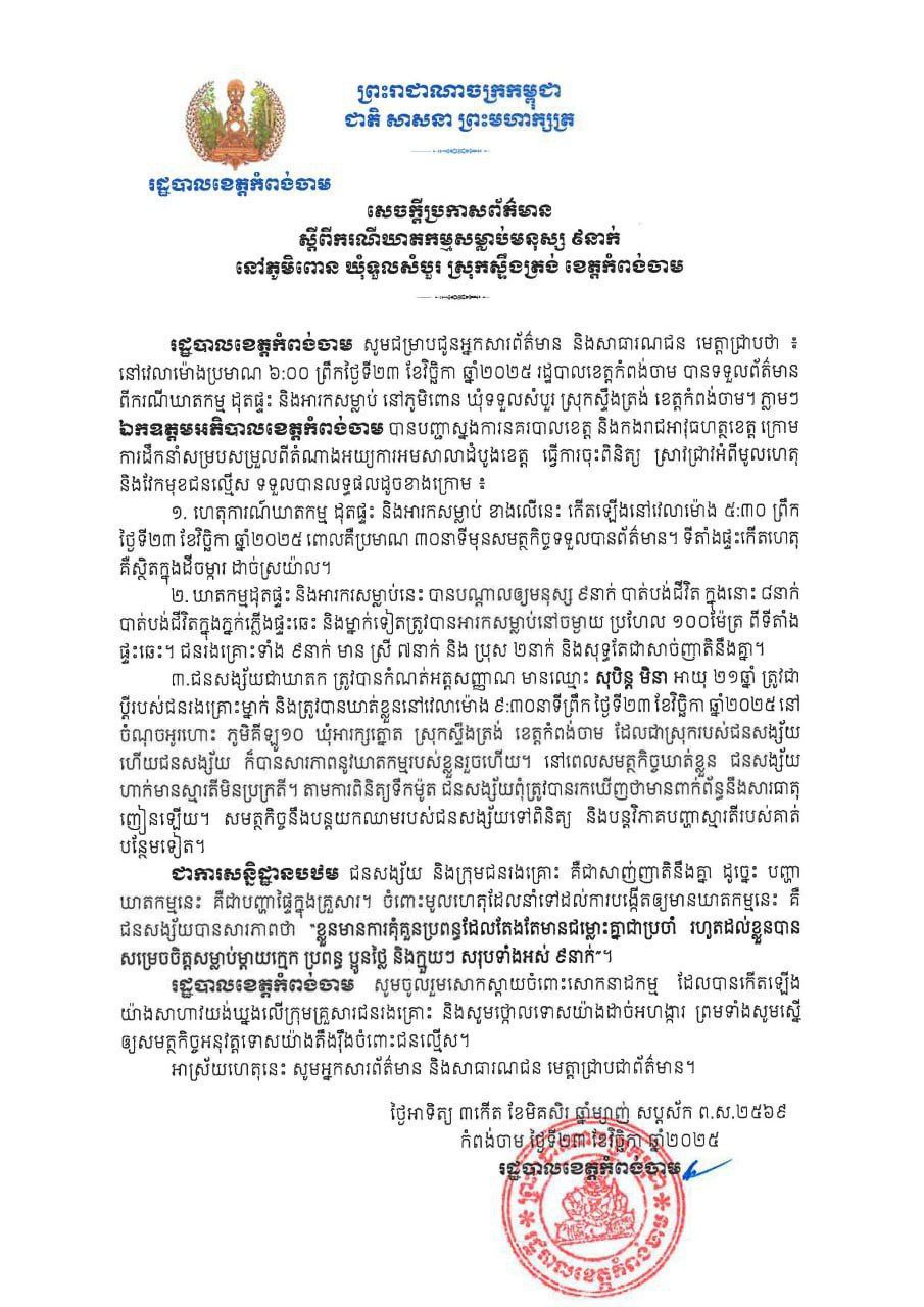 រដ្ឋបាលខេត្តកំពង់ចាម ជម្រាបជូនអ្នកសារព័ត៌មាន និងសាធារណជន មេត្តាជ្រាបថា នៅវេលាម៉ោងប្រមាណ៦:០០ព្រឹកថ្ងៃទី២៣ ខែវិច្ឆិកា ឆ្នាំ២០២៥ រដ្ឋបាលខេត្តកំពង់ចាម បានទទួលព័ត៌មានពីករណីឃាតកម្មដុតផ្ទះ និងអារ.កសម្លា.ប់ នៅភូមិពោន ឃុំទទួលសំបូរ ស្រុកស្ទឹងត្រង់ ខេត្តកំពង់ចាម ។