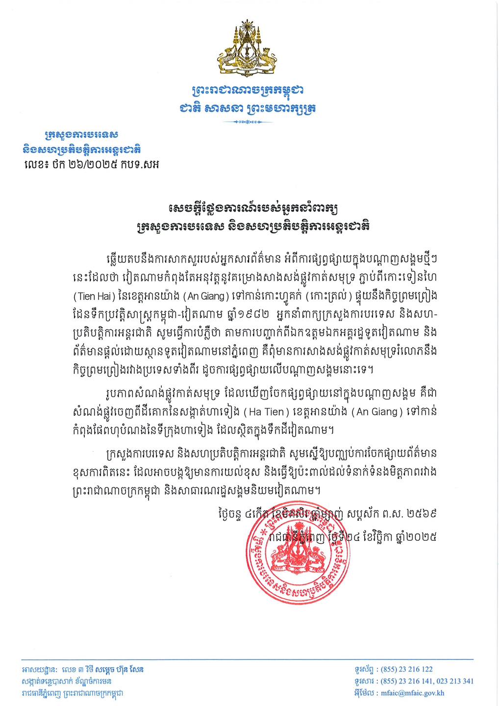 រាជធានីភ្នំពេញ ៖ អ្នកនាំពាក្យក្រសួងការបរទេស និងសហប្រតិបត្តិការអន្តរជាតិ បានចេញសេចក្តីថ្លៃងការណ៍នៅថ្ងៃទី២៤ ខែវិច្ឆិកា ឆ្នាំ២០២៥នេះ ឆ្លើយតបនឹងការសាកសួររបស់អ្នកសារព័ត៌មាន អំពីការផ្សព្វផ្សាយក្នុងបណ្តាញសង្គមថ្មីៗ នេះដែលថា វៀតណាមកំពុងតែអនុវត្ត នូវគម្រោងសាងសង់ផ្លូវកាត់សមុទ្រ ភ្ជាប់ពីកោះទៀនហៃ (Tien Hai) នៃខេត្តអានយ៉ាង (An Giang) ទៅកាន់កោះហ្វូគក់ (កោះត្រល់) ផ្ទុយនឹងកិច្ចព្រមព្រៀងដែនទឹកប្រវត្តិសាស្ត្រកម្ពុជា-វៀតណាម ឆ្នាំ១៩៨២ អ្នកនាំពាក្យក្រសួងការបរទេស និងសហប្រតិបត្តិការអន្តរជាតិ សូមធ្វើការបំភ្លឺថា តាមការបញ្ជាក់ពីឯកឧត្តម ឯកអគ្គរដ្ឋទូតវៀតណាម និងព័ត៌មានផ្ដល់ដោយស្ថានទូតវៀតណាមនៅភ្នំពេញ គឺពុំមានការសាងសង់ផ្លូវកាត់សមុទ្ររំលោភនឹងកិច្ចព្រមព្រៀងរវាងប្រទេសទាំងពីរ ដូចការផ្សព្វផ្សាយលើបណ្តាញសង្គមនោះទេ ។