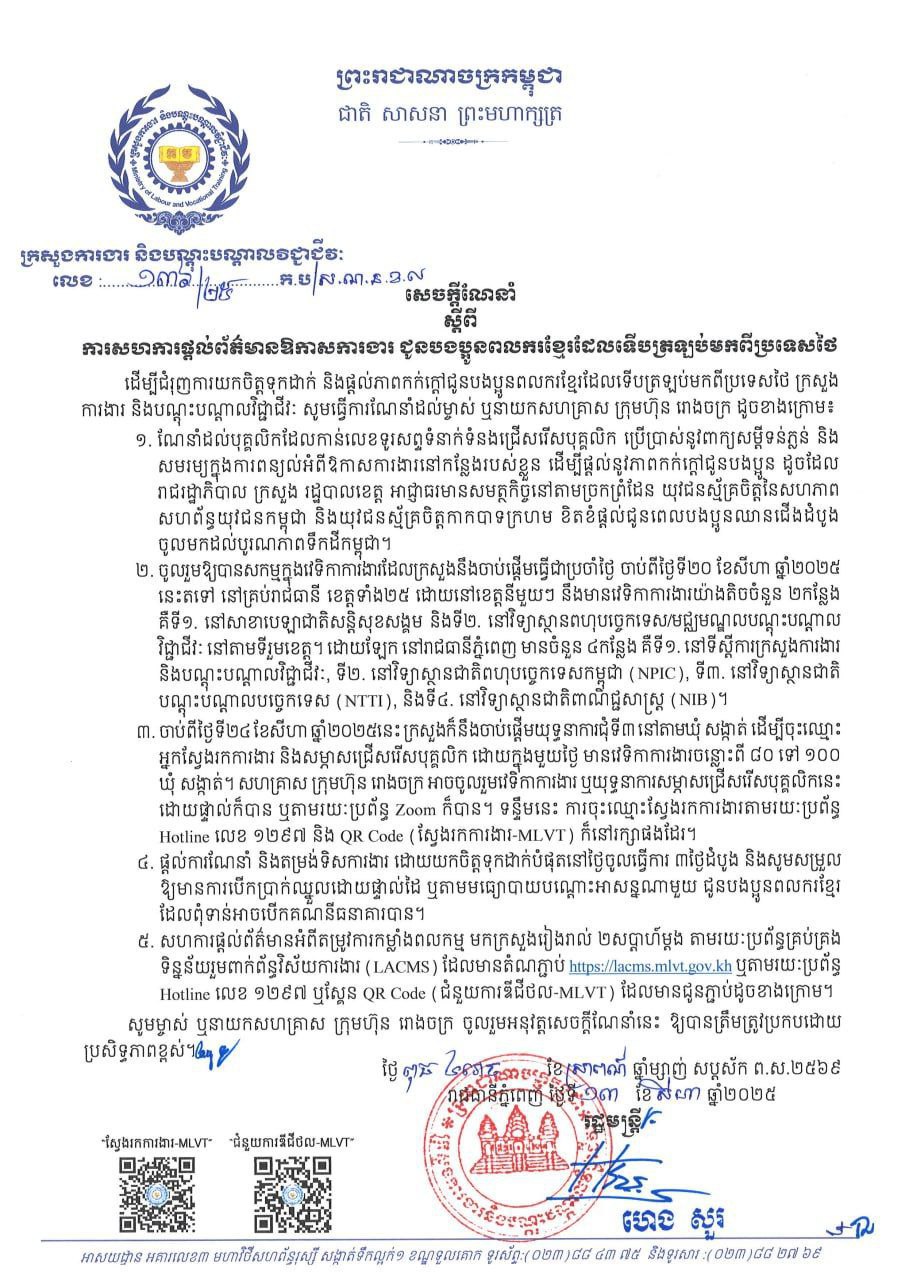 ការអំពាវនាវរបស់អ្នកនាំពាក្យក្រសួងការងារ និងបណ្តុះបណ្តាលវិជ្ជាជីវៈ គឺជាការជំរុញការយកចិត្តទុកដាក់ និងផ្តល់ភាពកក់ក្តៅជូនបងប្អូនអតីតពលករខ្មែរ ដែលត្រឡប់មកពីប្រទេសថៃ ទាំងពេលទំនាក់ទំនងផ្តល់ឱកាសការងារ និងពេលបំពេញការងារ ត្រូវមានភាពទន់ភ្លន់ យកចិត្តទុកដាក់ឱ្យដូចដែលរាជរដ្ឋាភិបាល ក្រសួង រដ្ឋបាលខេត្ត អាជ្ញាធរមានសមត្ថកិច្ចនៅតាមច្រកព្រំដែន យុវជនស្ម័គ្រចិត្ត នៃសហភាពសហព័ន្ធយុវជនកម្ពុជា និងយុវជនស្ម័គ្រចិត្តកាកបាទក្រហម ខិតខំផ្ដល់ជូនពេលបងប្អូនឈានជើងដំបូងចូលមកដល់បូរណភាពទឹកដីកម្ពុជា។