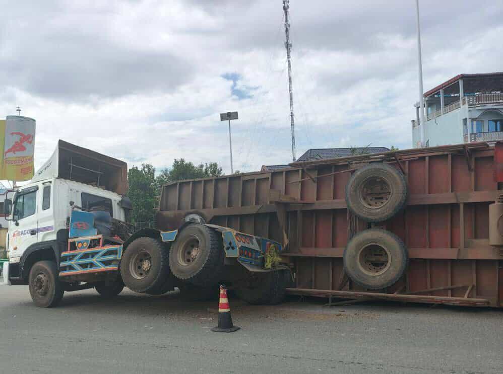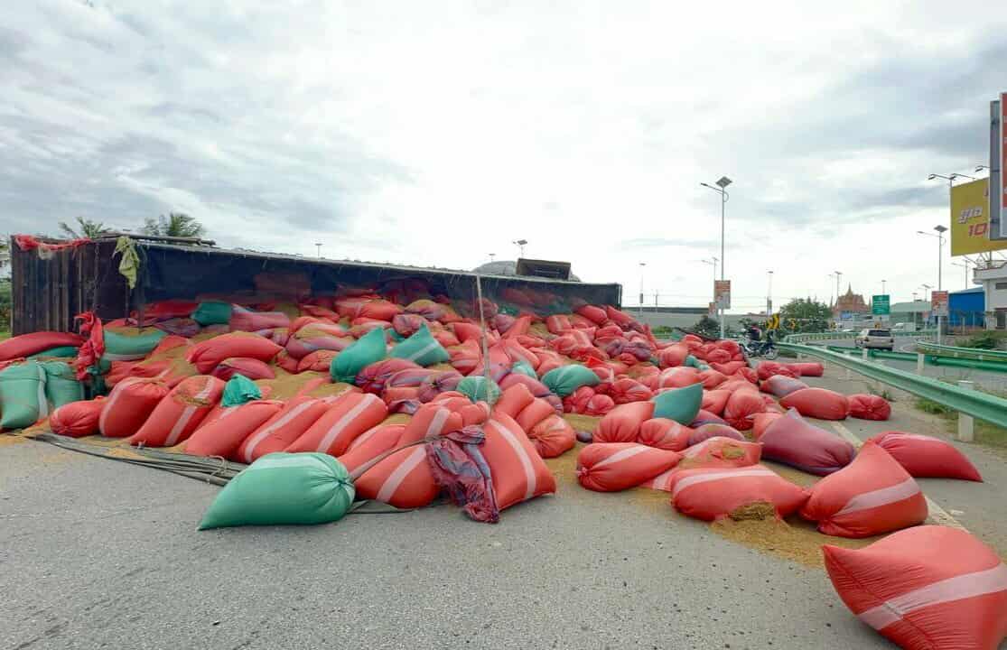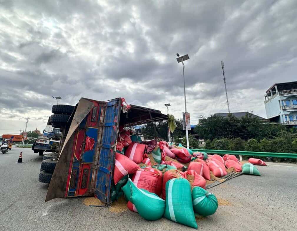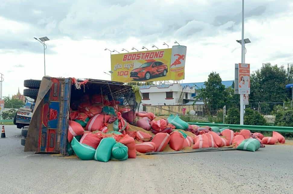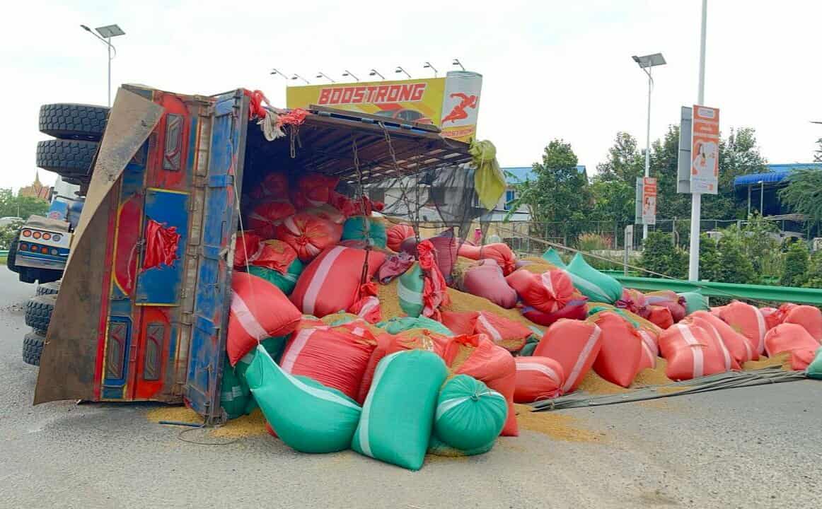 រាជធានីភ្នំពេញ ៖ រថយន្ដប្រភេទយីឌុប ដឹកស្រូវឌុប១គ្រឿងបានបើកលឿន លុះដល់ត្រង់ចំណុចរង្វង់មូលផ្លូវកោងក៍បានជាន់ហ្វ្រាំងបង្ខំ ក៍បានកាច់ទ្រុងក្រឡាប់ចាក់ស្រូវចោលពេញផ្លូវ ប៉ុន្តែសំណាងល្អពុំបណ្ដាលឲ្យសង្កត់អ្នកដំណើរតាមផ្លូវនោះឡើយ ។