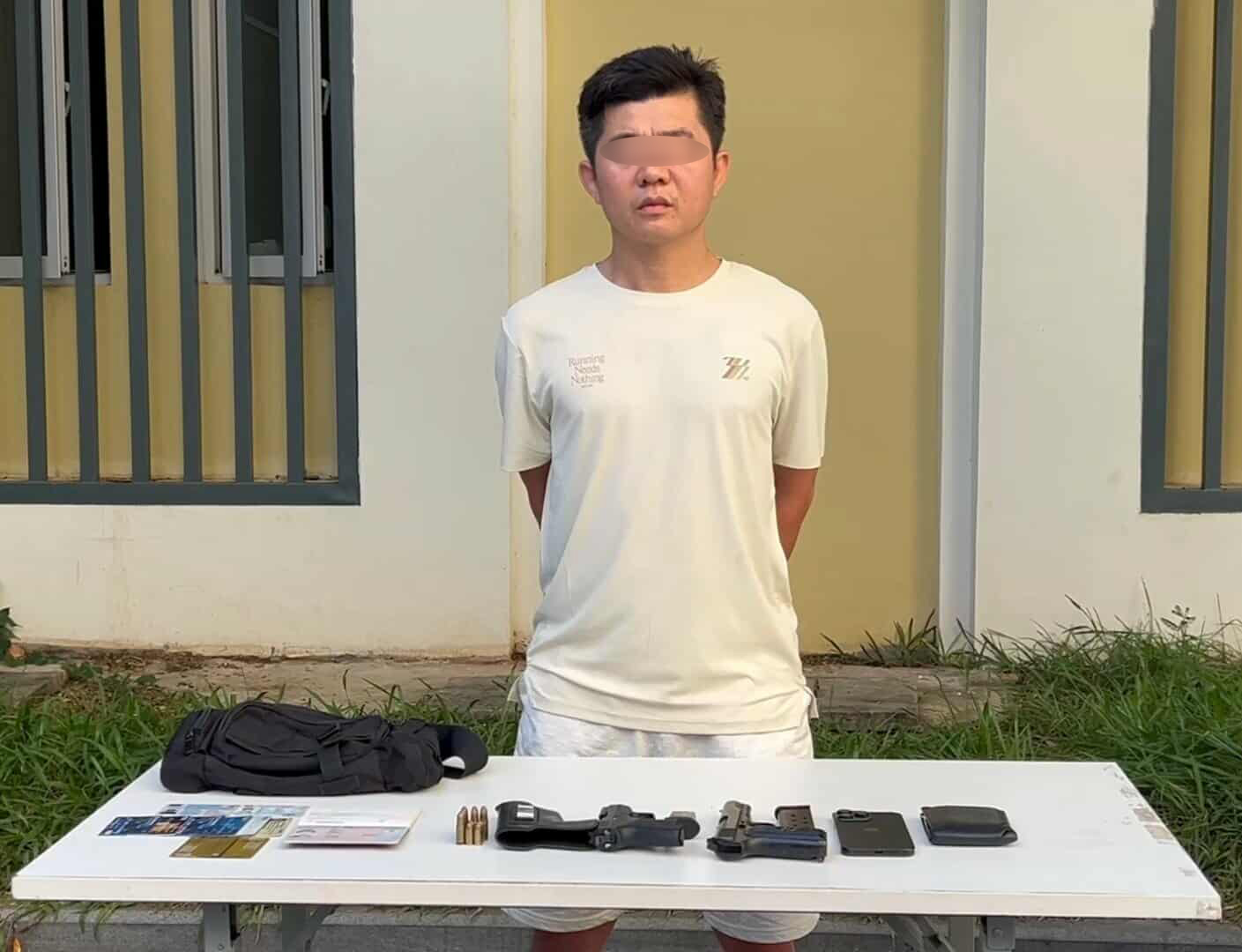 ជនសង្ស័យរូបនោះឈ្មោះ សុង ឆាយ ហៅគួន អ៊ី ភេទប្រុស អាយុ៣៤ឆ្នាំ មុខរបរមិនពិតប្រាកដ ទីលំនៅបច្ចុប្បន្ន ផ្ទះលេខ១ ផ្លូវ១០៨ ភូមិត្នោតជ្រុំ សង្កាត់បឹងទំពុន ខណ្ឌមានជ័យ រាជធានីភ្នំពេញ ។ បន្ទាប់ពីឃាត់ខ្លួន សមត្ថកិច្ចដកហូត, ១-អាវុធខ្លីម៉ាក K ៥៤ លេខ៧៤៨១ គ្រាប់៨គ្រាប់, ២-អាវុធខ្លីម៉ាក zaraki M៩០៦ គ្រាប់៤គ្រាប់។