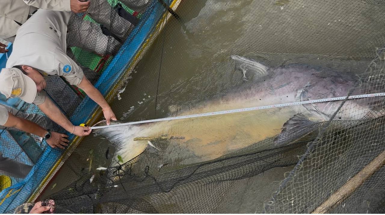 គួរឱ្យដឹងដែរថា ត្រីរាជដែលត្រូវបានជួយសង្គ្រោះនេះត្រូវបានវាស់វែង និងថ្លឹងបាននូវទិន្នន័យគួរឲ្យចាប់អារម្មណ៍ ដោយមានទម្ងន់៩៥ គីឡូក្រាម ប្រវែង២១៦សង់ទីម៉ែត្រ ។ កិច្ចការនេះ ក្រុមការងារបានសហការគ្នាយ៉ាងយកចិត្តទុកដាក់ ដើម្បីបំពាក់ស្លាកសម្គាល់ដល់ត្រីរាជខាងលើ មុននឹងធ្វើការលែងវាទៅក្នុងបឹងទន្លេសាបវិញ ដែលជាទីជម្រកធម្មជាតិរបស់វា ។ ការបំពាក់ស្លាកនេះ មានគោលបំណងតាមដានការបន្លាស់ទី និងជម្រករបស់ត្រីក្នុងរដូវប្រាំង ដើម្បីបម្រើដល់កិច្ចការស្រាវជ្រាវ និងអភិរក្ស ។
