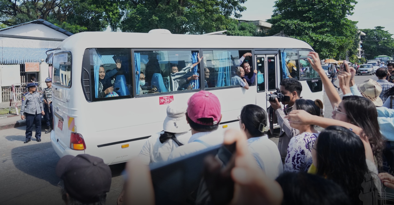រថយន្តបឺសយ៉ាងតិច៨គ្រឿងដែលដឹកអ្នកទោសត្រូវបានស្វាគមន៍យ៉ាងកងរំពងដោយសាច់ញាតិ និងមិត្តភក្ដិរបស់ពួកគេដែលរង់ចាំយ៉ាងត្រៀបត្រានៅខាងក្រៅមាត់ច្រកចេញចូលនៃពន្ធនាគារប្រចាំទីក្រុងរ៉ង់ហ្គូនមួយនេះ។ របបសឹកបានលើកលែងទោសទណ្ឌិតជាង៣ពាន់នាក់ដែលប្រឆាំងនឹងរបបដឹកនាំរបស់ពួកគេ និងទម្លាក់ចោលការចោទប្រកាន់ទៅលើជនសង្ស័យ៥៥០០នាក់។ នេះបើយោងតាមការផ្សាយរបស់ទូរទស្សន៍រដ្ឋមីយ៉ាន់ម៉ាអឹមអ័រធីវី (MRTV)។