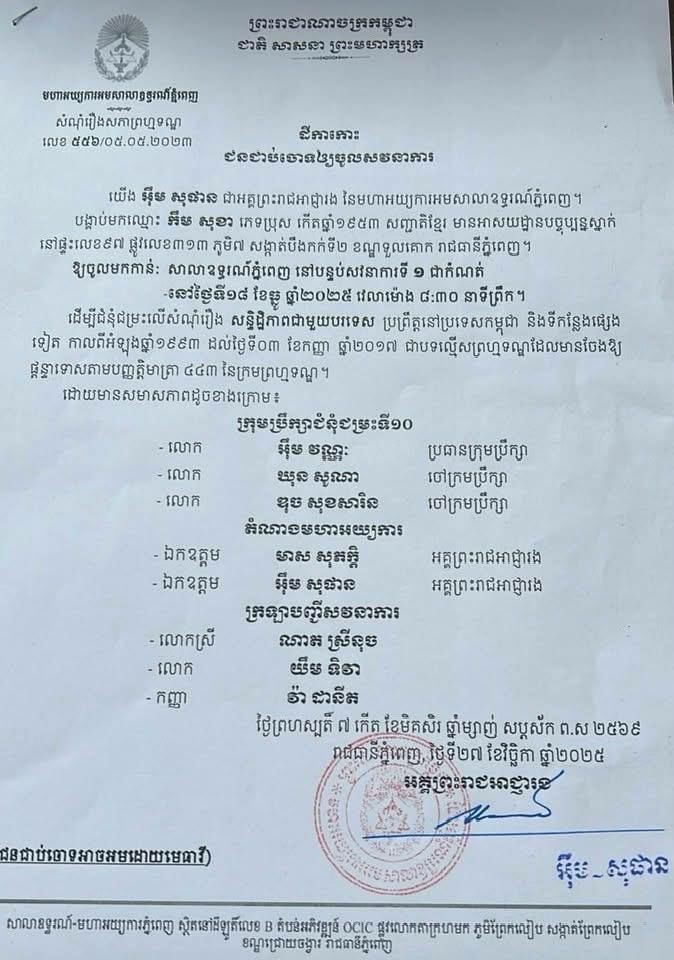 រាជធានីភ្នំពេញ ៖ កាលពីថ្ងៃទី១៧ ខែវិច្ឆិកា ឆ្នាំ២០២៥ លោក អ៊ឹម សុផាន អគ្គព្រះរាជអាជ្ញារង នៃមហាអយ្យការអមសាលាឧទ្ធរណ៍ភ្នំពេញ បានចេញដីកាកោះ បង្គាប់មកឈ្មោះ កឹម សុខា ភេទប្រុស កើតឆ្នាំ១៩៥៣ សញ្ជាតិខ្មែរ មានអាសយដ្ឋានបច្ចុប្បន្នស្នាក់នៅផ្ទះលេខ៩៧ ផ្លូវលេខ៣១៣ ភូមិ៧ សង្កាត់បឹងកក់ទី២ ខណ្ឌទួលគោក រាជធានីភ្នំពេញ ឲ្យចូលមកកាន់សាលាឧទ្ធរណ៍ នៅបន្ទប់សវនាការទី១ ជាកំណត់ នៅថ្ងៃទី១៨ ខែធ្នូ ឆ្នាំ២០២៥ វេលាម៉ោង៨និង៣០នាទីព្រឹក ដើម្បីជំនុំជម្រះលើសំណុំរឿង “សន្ទិដ្ឋិភាពជាមួយបរទេស” ប្រព្រឹត្តនៅប្រទេសកម្ពុជា និងទីកន្លែងផ្សេងទៀត កាលពីអំឡុងឆ្នាំ១៩៩៣ ដល់ថ្ងៃទី០៣ ខែកញ្ញា ឆ្នាំ២០១៧ ជាបទល្មើសព្រហ្មទណ្ឌដែលមានចែងឲ្យផ្តន្ទាទោសតាមបញ្ញត្តិមាត្រា ៤៤៣ នៃក្រមព្រហ្មទណ្ឌ ។ ដោយមានសមាសភាពដូចខាងក្រោម ៖