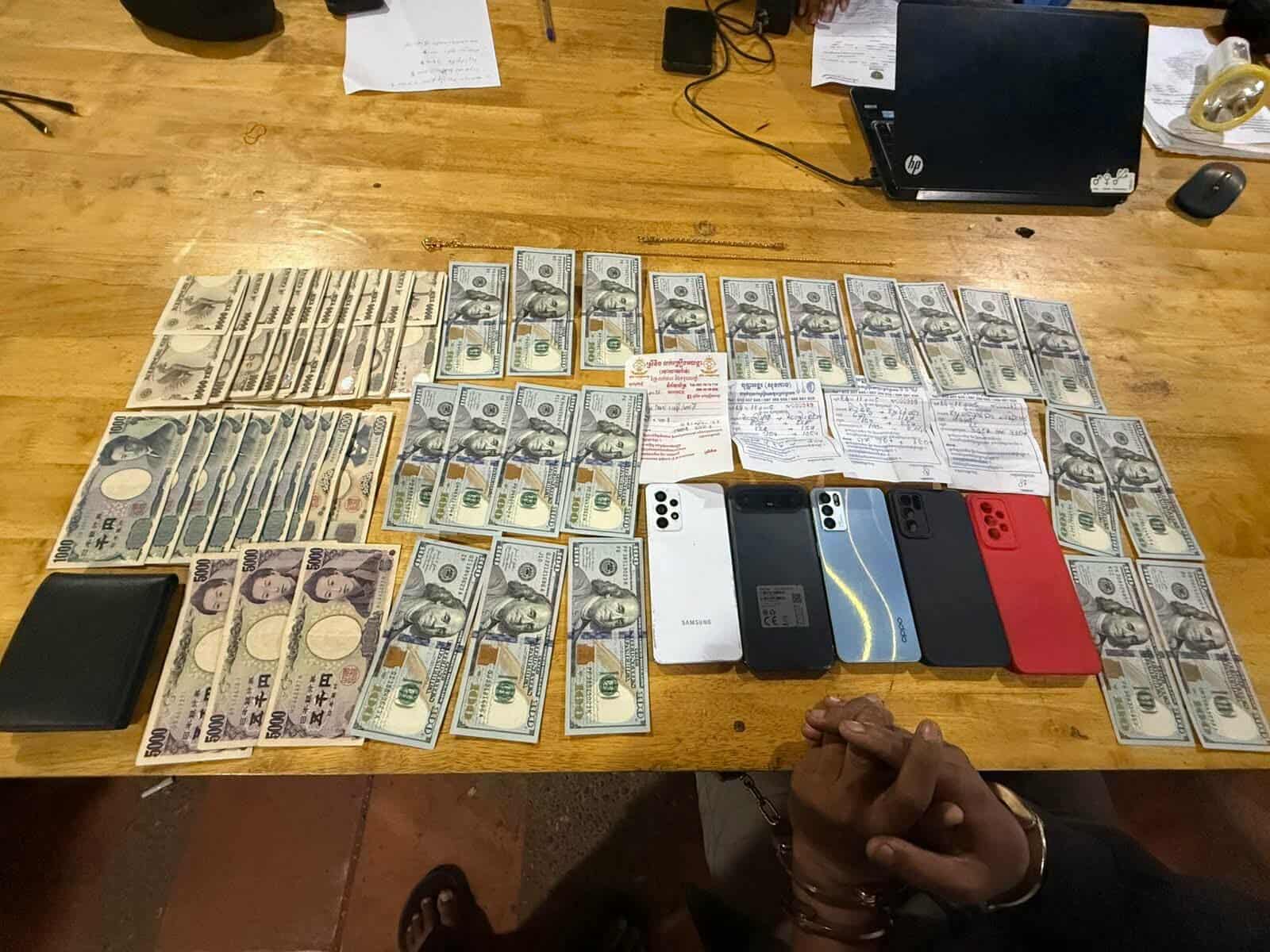 បន្ទាប់ពីឃាត់ខ្លួនសមត្ថកិច្ចដករហូតសម្ភារៈរួមមាន៖ ម៉ូតូចំនួន០១គ្រឿងម៉ាក ADV ពណ៌ស ពាក់ស្លាកលេខភ្នំពេញ 1MB5101,ទូរសព្ទចំនួន០៣គ្រឿង ,លោហៈធាតុខ្សែក ប្រវែង៥៥ សង់ទីម៉ែត្រ ចំនួន១ខ្សែមានបន្តោងរូបយុទ្ធនាការ,លោហៈធាតុប្រភេទខ្សែដៃ ប្រវែង ១៨សង់ទីម៉ែត្រ,លោហ:ធាតុប្រភេទចិញ្ចៀន ១វង់, ប្រាក់ចំនួន២១០០$(ដុល្លារអាមេរិក),ប្រាក់ចំនួន១០២៤០០០យេន