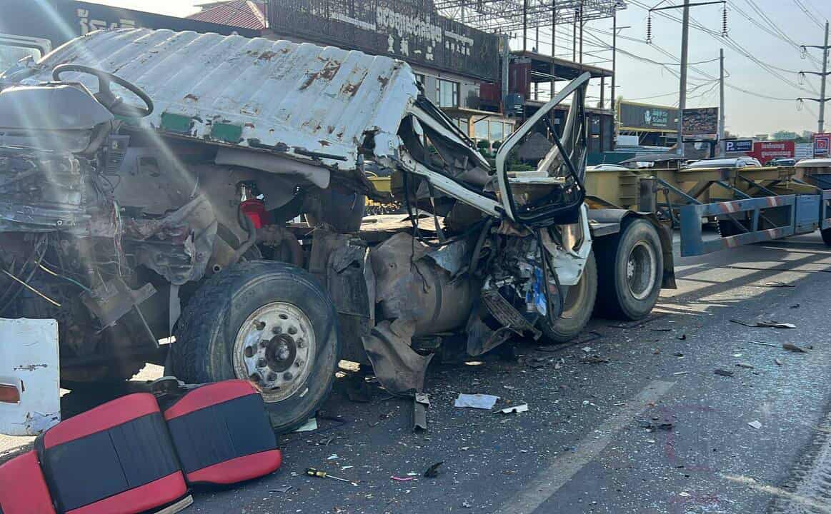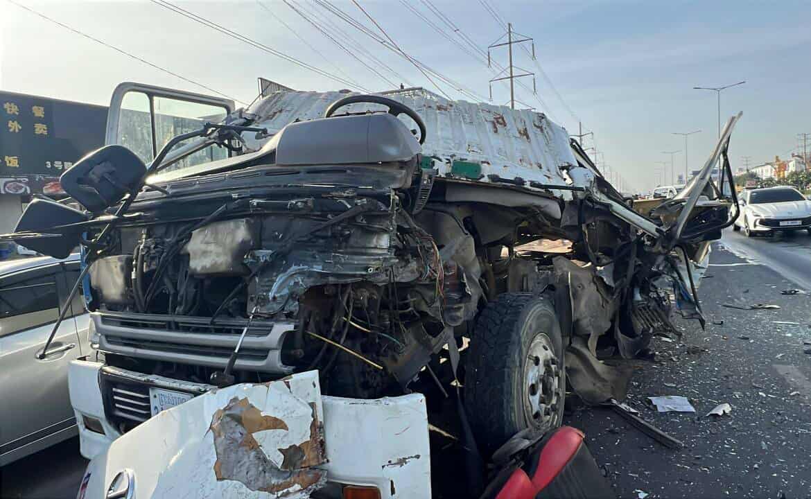 រាជធានីភ្នំពេញ ៖ រថយន្តសណ្ដោងទូកុងតឺន័រមួយគ្រឿង បានបើកបរក្នុងល្បឿនលឿន គេចយានយន្តនៅពីមុខក៏បានជ្រុលចង្កូតទៅឆ្វេងដៃបុកកន្ទុយកុងតឺន័រមួយគ្រឿងទៀត បណ្ដាលឲ្យខ្ទេចមុខខ្លួនឯងហើយ អ្នកបើកបរងរបួសធ្ងន់ ។ នៅក្នុងគ្រោះថ្នាក់នោះដែរ ក៏បានបុករុញទៅប៉ះជាមួយរថយន្តកាមរីមួយគ្រឿងទៀត រងការខូចខាតផងដែរ ។