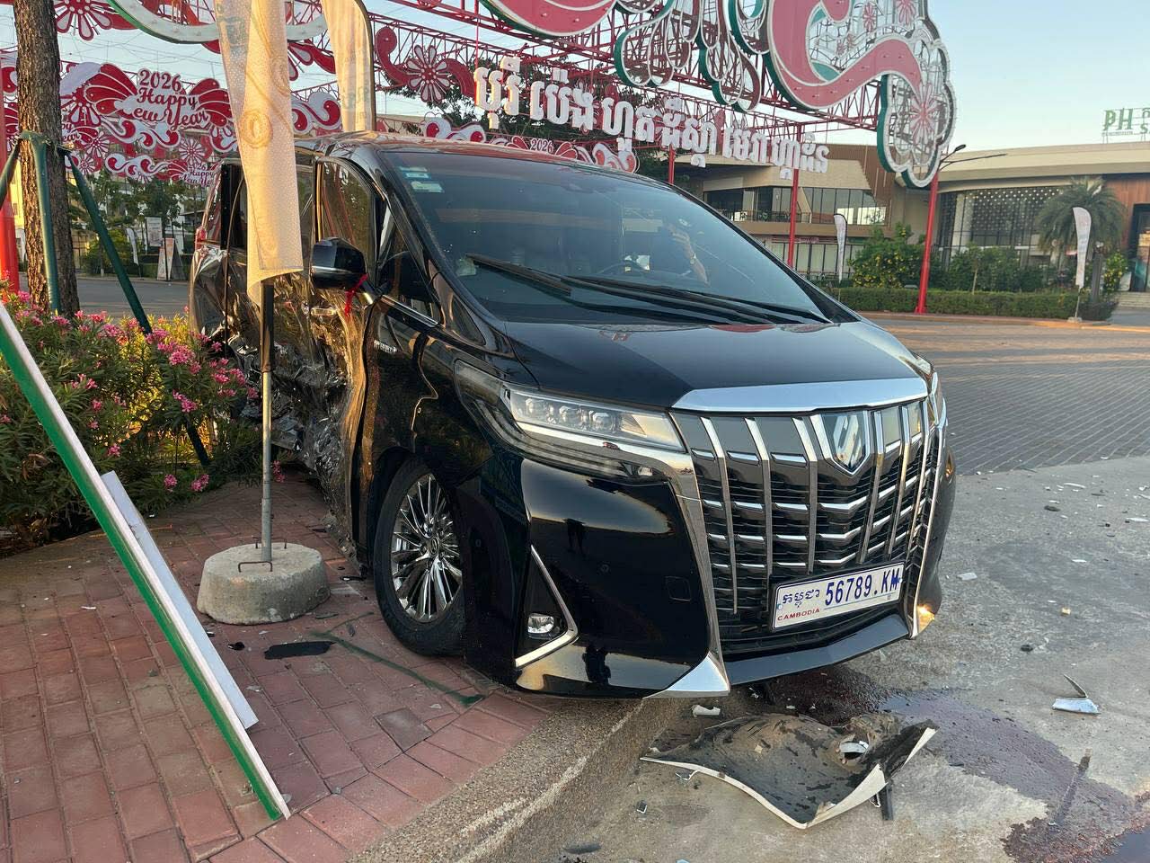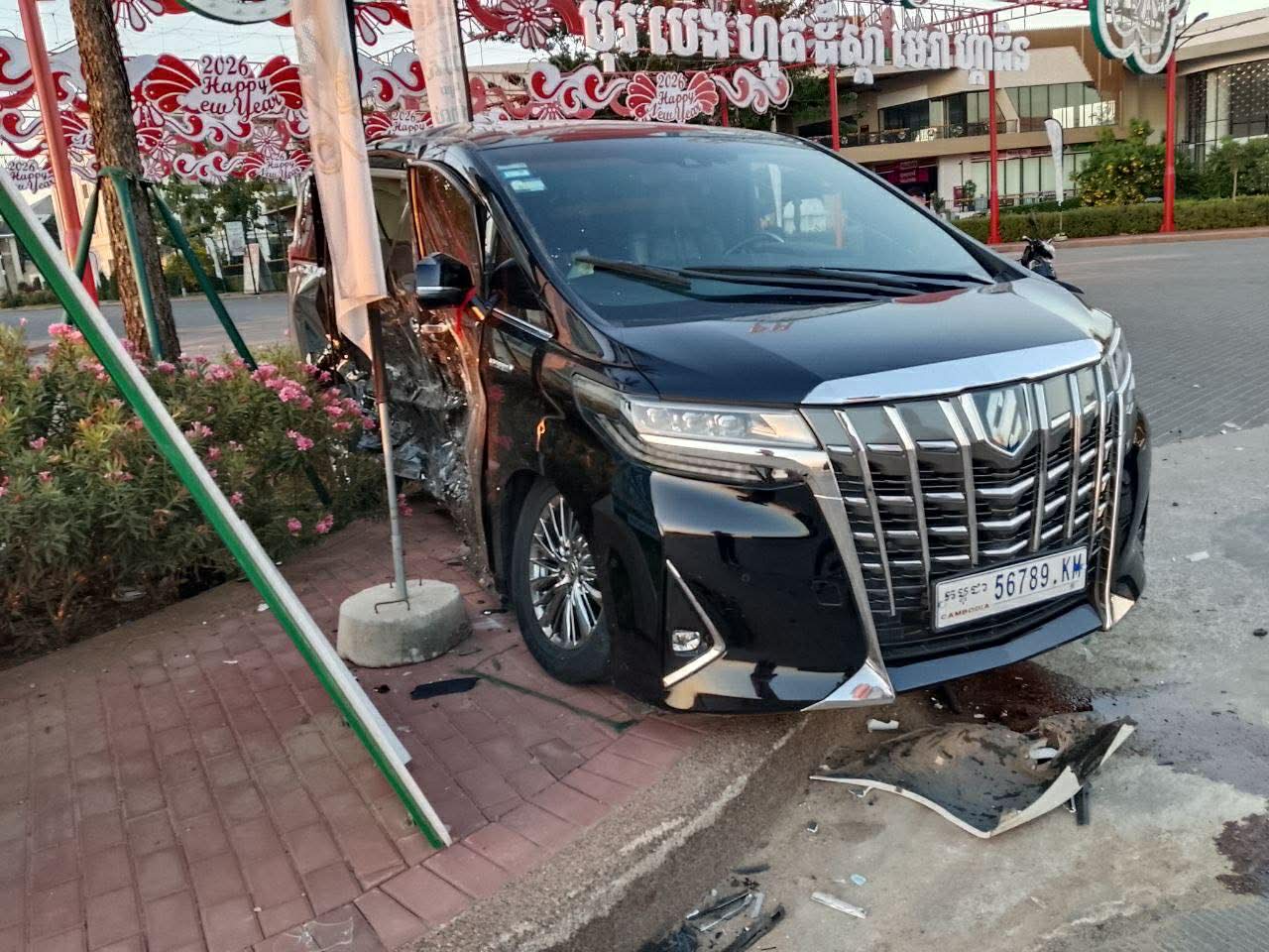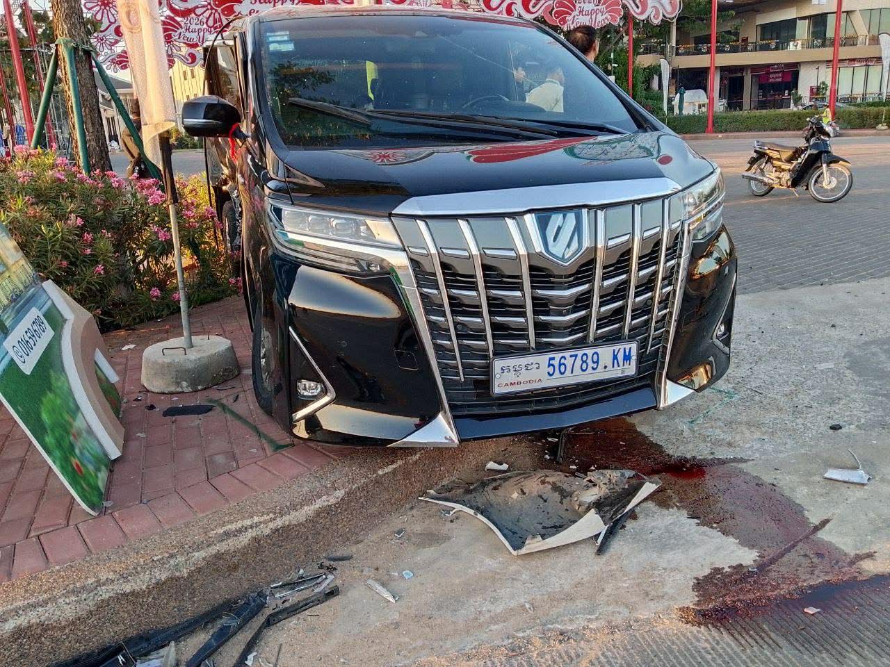រថយន្តម៉ាកToyota Alphardខាងលើពណ៍ខ្មៅ ពាក់ស្លាកលេខកម្ពុជា 56789-KM រងការខូចខាតខ្ទេច១ចំហៀងខ្លួនខាងស្ដាំ ហើយអ្នកបើកបរមិនបានរងរបួសឡើយចំណែករថយន្តម៉ាកToyota Camaryពណ៍ស ពាក់ស្លាកលេខ ភ្នំពេញ2BD- 3699ខូចខាតខ្ទេចមុខ ។