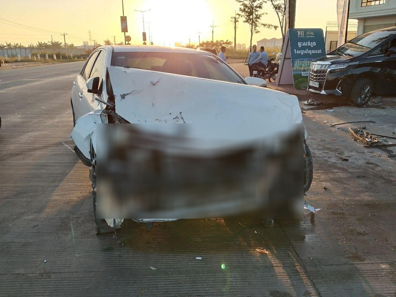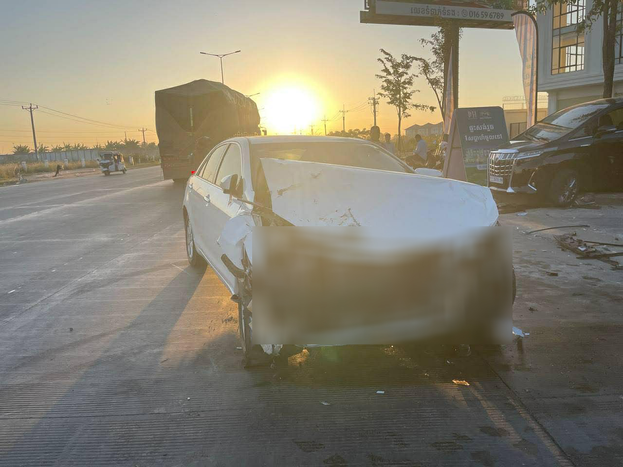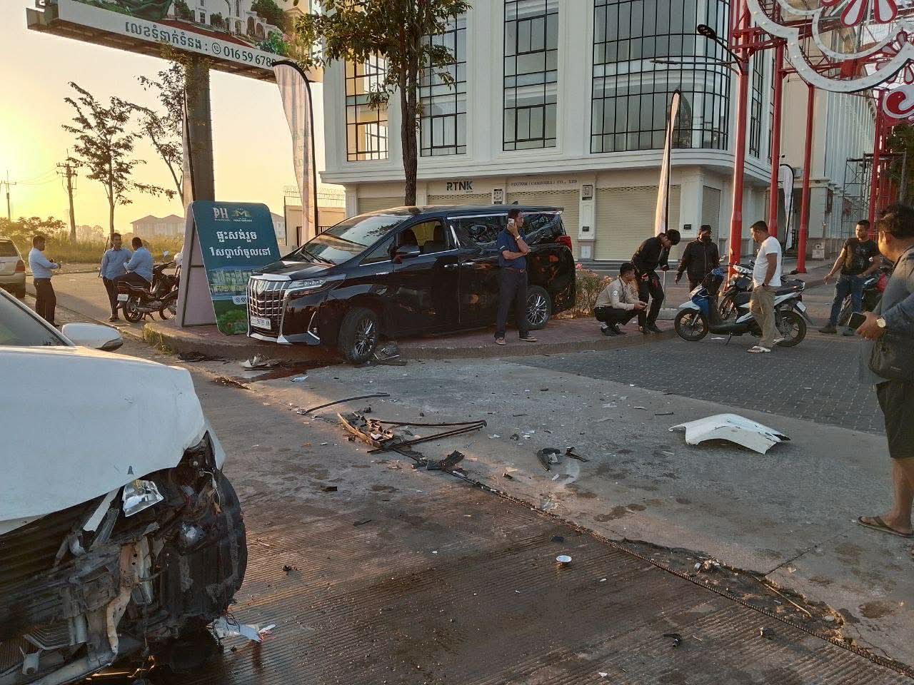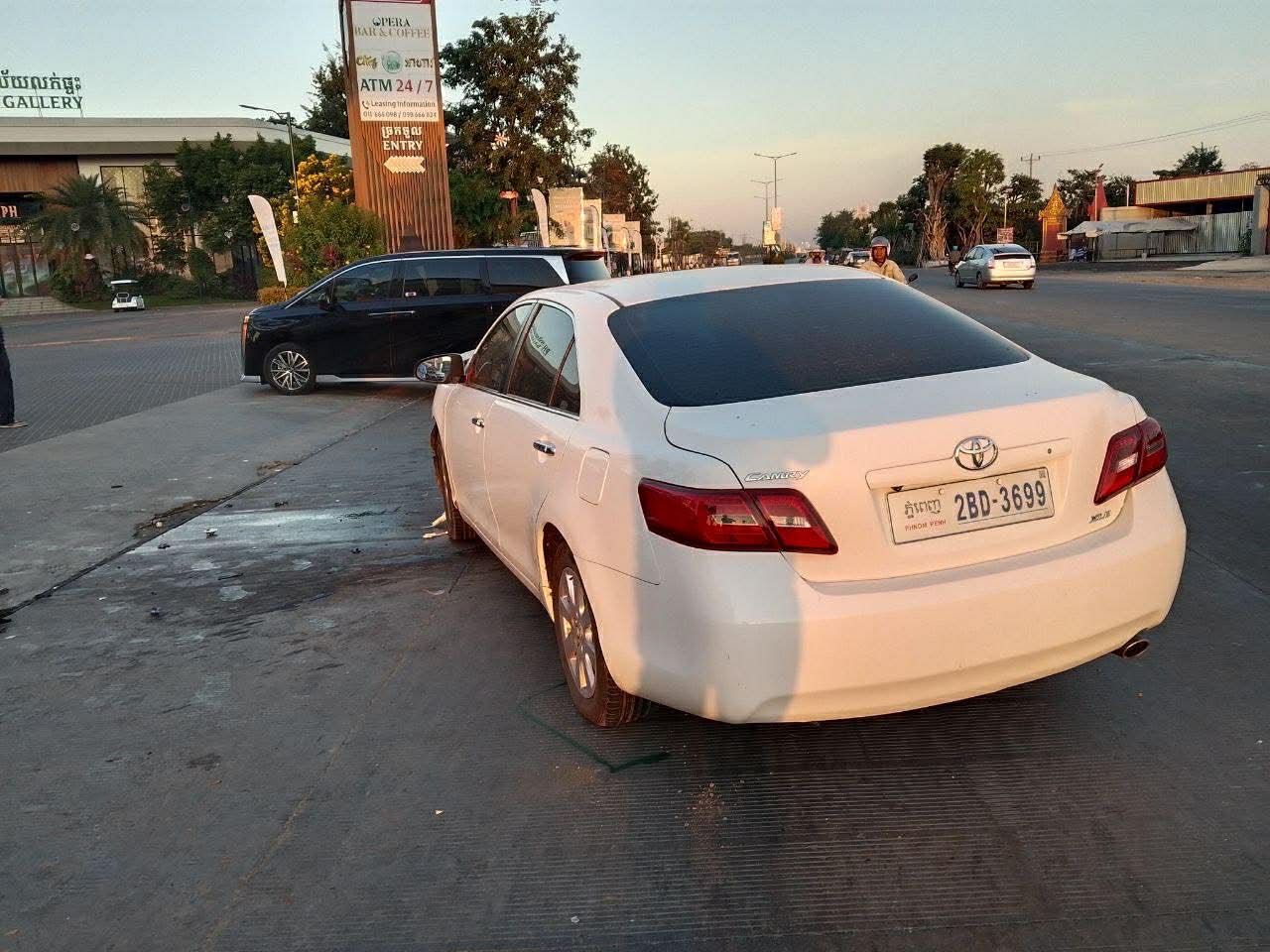 រថយន្តម៉ាកToyota Alphardខាងលើពណ៍ខ្មៅ ពាក់ស្លាកលេខកម្ពុជា 56789-KM រងការខូចខាតខ្ទេច១ចំហៀងខ្លួនខាងស្ដាំ ហើយអ្នកបើកបរមិនបានរងរបួសឡើយចំណែករថយន្តម៉ាកToyota Camaryពណ៍ស ពាក់ស្លាកលេខ ភ្នំពេញ2BD- 3699ខូចខាតខ្ទេចមុខ ។