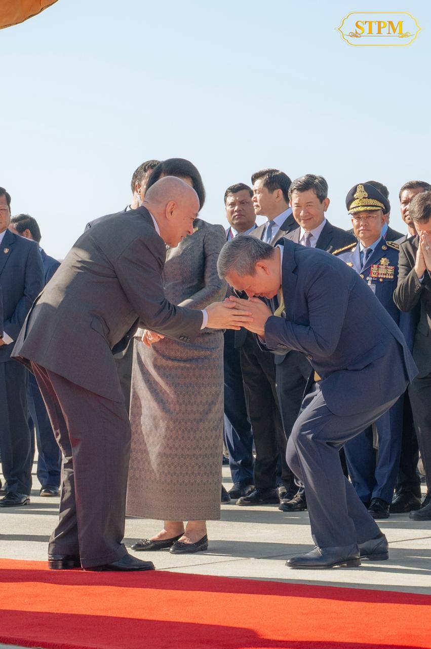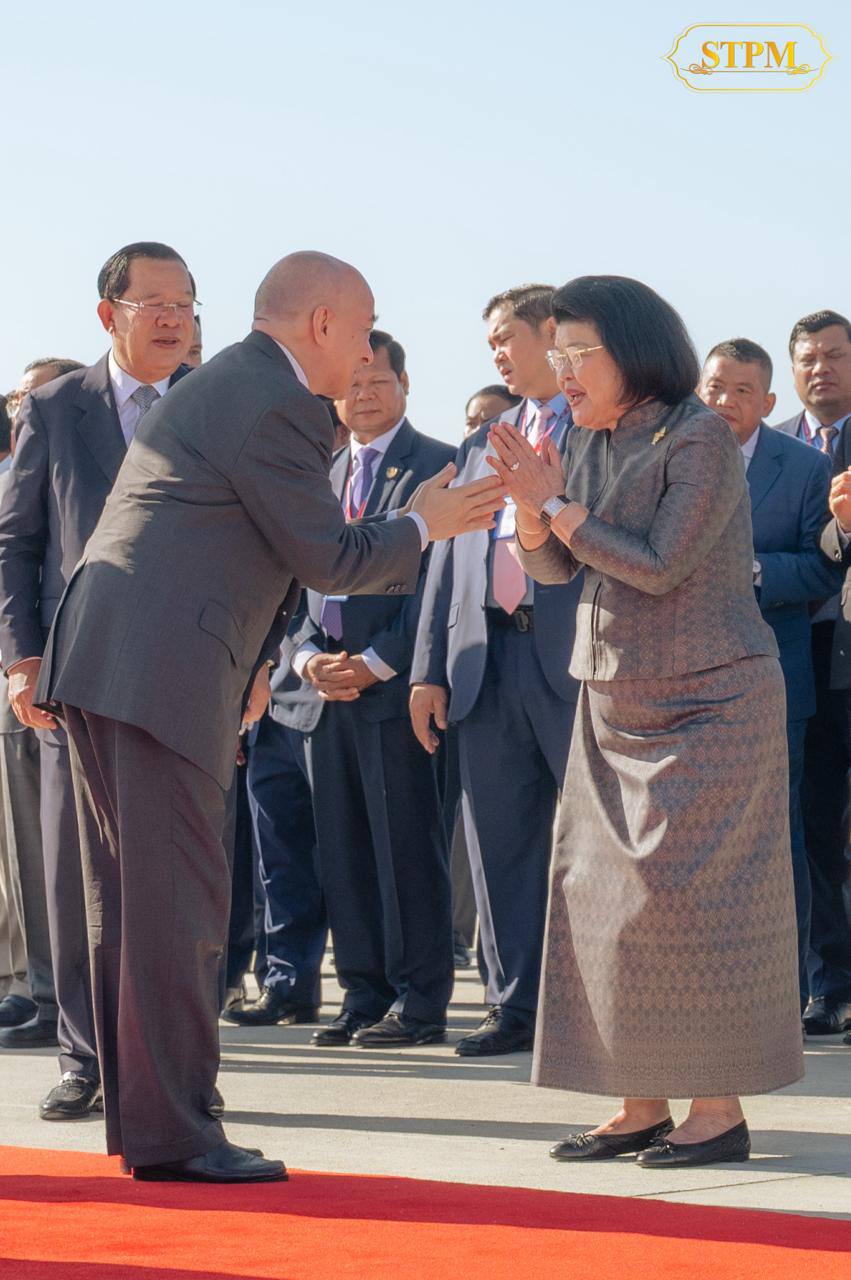យាង និងអញ្ជើញថ្វាយព្រះរាជដំណើរព្រះករុណាព្រះមហាក្សត្រ នៅឯអាកាសយានដ្ឋានអន្តរជាតិតេជោ មានវត្តមានរបស់សម្ដេចអគ្គមហាសេនាបតីតេជោ ហ៊ុន សែន ប្រធានព្រឹទ្ធសភានៃព្រះរាជាណាចក្រកម្ពុជា សម្ដេចមហារដ្ឋសភាធិការធិបតី ឃួន សុដារី ប្រធានរដ្ឋសភា សម្ដេចមហាបវរធិបតី ហ៊ុន ម៉ាណែត នាយករដ្ឋមន្ត្រីនៃព្រះរាជាណាចក្រកម្ពុជា ព្រមទាំងសម្ដេច ឯកឧត្ដម លោកជំទាវ ជាសមាជិកសមាជិកា ឧត្ដមប្រឹក្សាផ្ទាល់ព្រះមហាក្សត្រ និងមន្ត្រីអ្នកមុខអ្នការជាច្រើនរូបទៀត ។