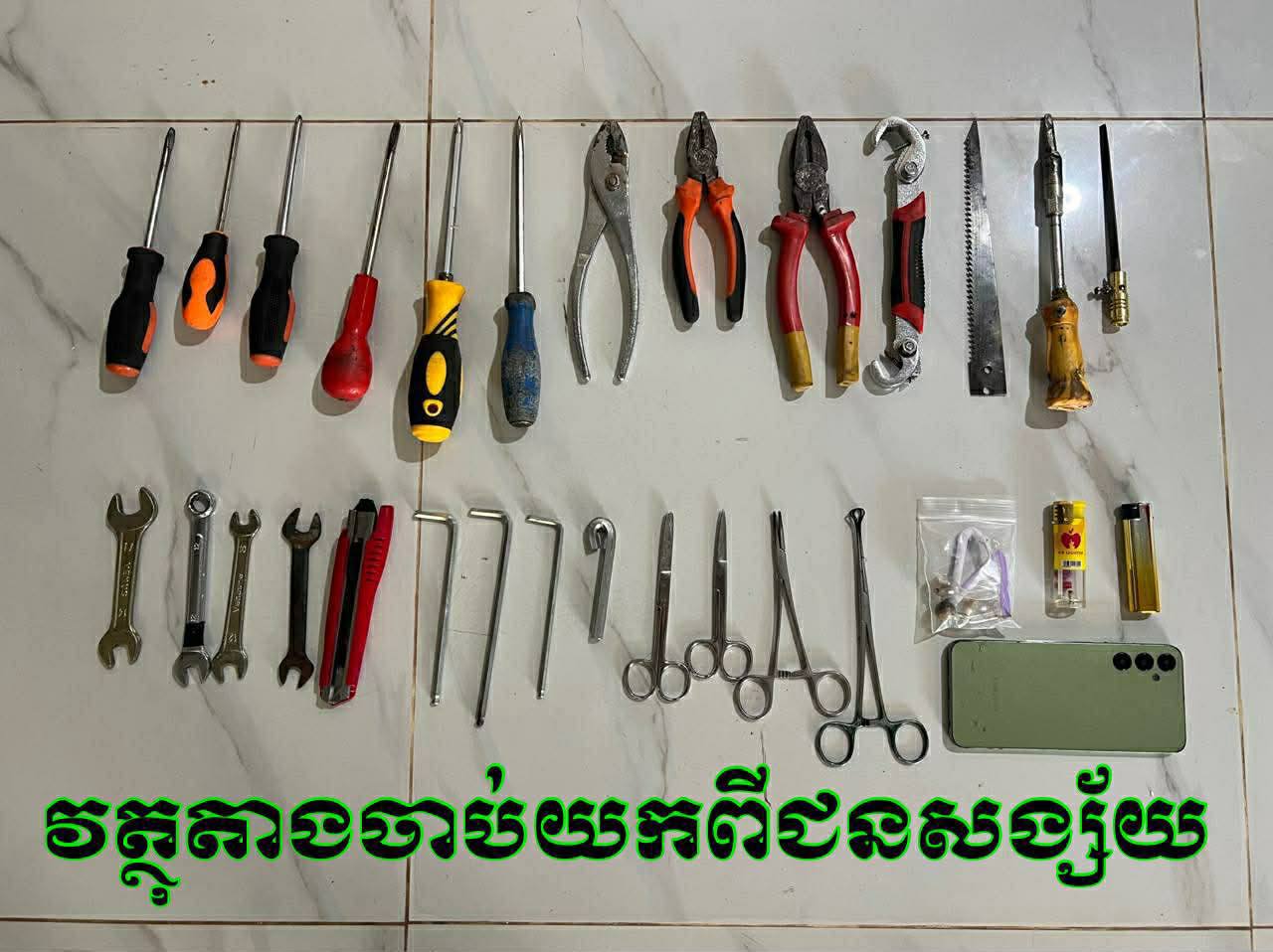 ទូរស័ព្ទដៃម៉ាក SAMSUNG ពណ៌ទឹកសណ្តែក ចំនួន ០១គ្រឿង ,កែវសម្រាប់ជក់ថ្នាំញៀនពណ៌សថ្លាចំនួន ០៣ , ដែកកេះចំនួន០២, ថ្នាំញៀនប្រភេទមេតំហ្វេតាមីនចំនួន ០១កញ្ចប់ ,ទម្ងន់សរុប ០,៧៣ក្រាម ,អាវយឺតដៃខ្លីពណ៌ខ្មៅ មានអក្សរជាភាសាអង្គគ្លេស (ESSENTIALS FEAR OF GOO) ចំនួន ០១,ខោក្រណាតជើងវែងពណ៌ប្រផេះចំនួន ០១, ម៉ាស់សម្រាប់ពាក់ពណ៌ទឹកប៊ីចចំនួន ០១ ,ទួណឺវីស ដងជ័រពណ៌ខៀវ ចំនួន ០៦ ,ដង្កាប់ចំនួន ០៣,កូនសោរ សម្រាប់ដោះខ្ចៅចំនួន ០៥,ដែកកែឆ្នៃចុងសំប៉ែតស្រួច ចំនួន ០១,រណាដែកចំនួន ០១ ,ដែកឆាបចំនួន ០១,កាំបិតរូតចំនួន ០១,កូនសោរតាន់ជ្រុងចំនួន ០៤ ,កន្ត្រៃចំនួន ០៤(ចាប់យកពីជនសង្ស័យឈ្មោះ អ៊ឹម ថា),ទូរស័ព្ទដៃម៉ាក OPPOពណ៌ខ្មៅ ចំនួន ០១គ្រឿង (ចាប់យកពីជនសង្ស័យឈ្មោះ សុខ សម្បត្តិលក្ខិណា ហៅ បាត់ )។