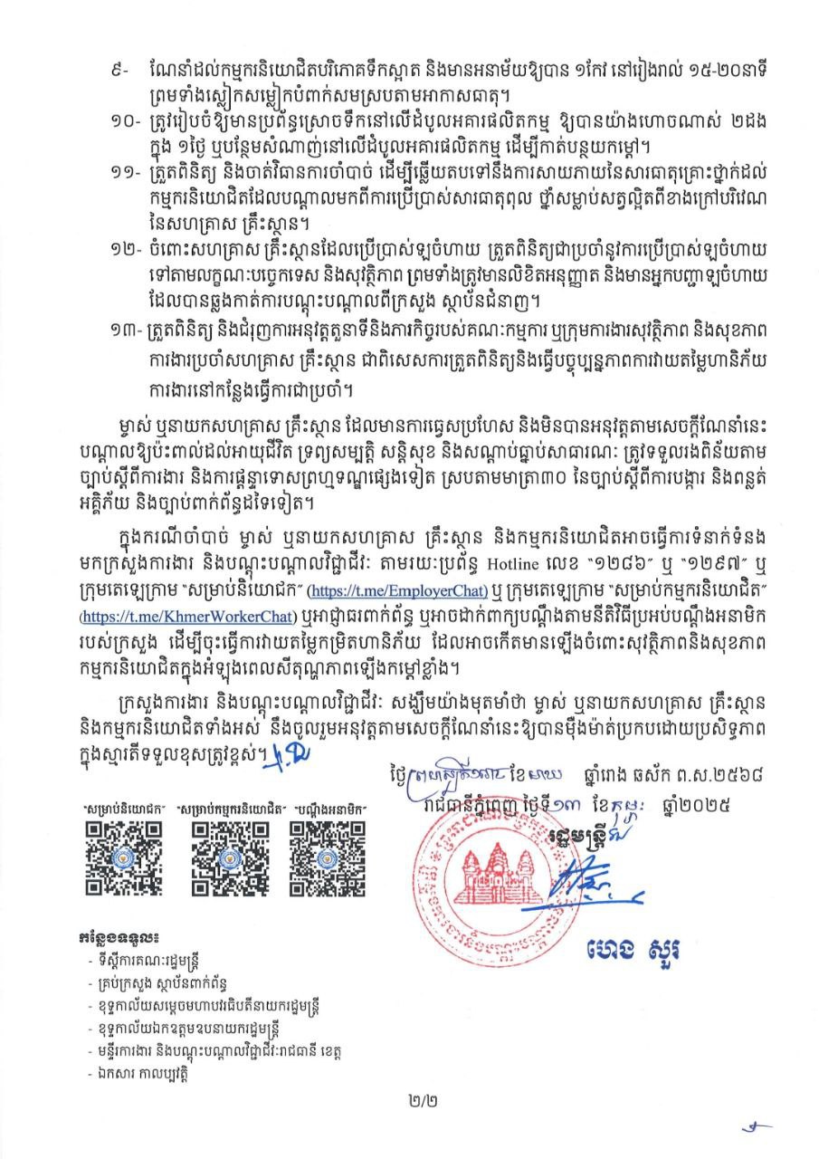 ក្រសួងការងារ និងបណ្តុះបណ្តាលវិជ្ជាជីវៈ សង្ឃឹមយ៉ាងមុតមាំថា ម្ចាស់ ឬនាយកសហគ្រាស គ្រឹះស្ថាន និងកម្មករនិយោជិតទាំងអស់ នឹងចូលរួមអនុវត្តតាមសេចក្តីណែនាំនេះឱ្យបានម៉ឺងម៉ាត់ប្រកបដោយប្រសិទ្ធភាព ក្នុងស្មារតីទទួលខុសត្រូវខ្ពស់ ៕ អត្ថបទសហការ