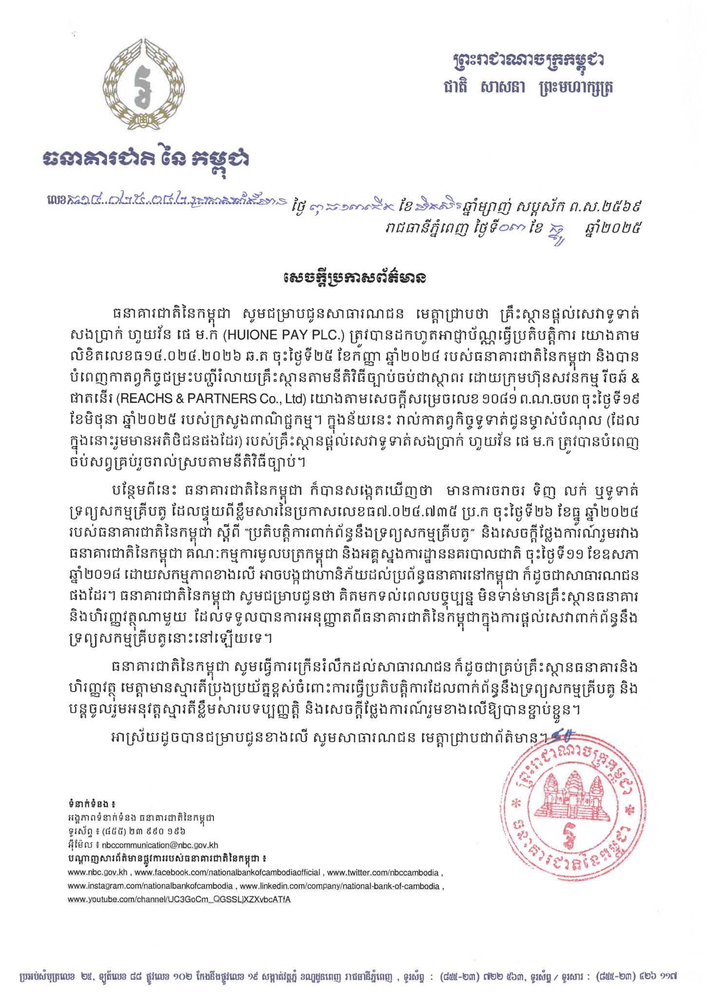 រាជធានីភ្នំពេញ ៖ ធនាគារជាតិនៃកម្ពុជា បានប្រកាសនារសៀលថ្ងៃទី០៣ ខែធ្នូ ឆ្នាំ២០២៥នេះថា គ្រឹះស្ថានផ្ដល់សេវាទូទាត់សងប្រាក់ ហួយវ័ន ផេ ម.ក(HUIONE PAY PLC.) ត្រូវបានដកហូតអាជ្ញាបណ្ណធ្វើប្រតិបត្ដិការ យោងតាមលិខិតចុះតាំងពីថ្ងៃទី២៥ ខែកញ្ញា ឆ្នាំ២០២៤ របស់ធនាគារជាតិនៃកម្ពុជា និងបានបំពេញកាតព្វកិច្ចជម្រះបញ្ជីរំលាយគ្រឹះស្ថានតាមនីតិវិធីច្បាប់ចប់ជាស្ថាពរ ដោយក្រុមហ៊ុនសវនកម្ម រីចឆ៍ & ផាតនើរ(REACHS & PARTNERS Co.,Ltd)។ ក្នុងន័យនេះរាល់កាតព្វកិច្ចទូទាត់ជូនម្ចាស់បំណុល(ដែលក្នុងនោះរួមមានអតិថិជនផងដែរ)របស់គ្រឹះស្ថាននេះ ត្រូវបានបំពេញចប់សព្វគ្រប់រួចរាល់ស្របតាមនីតិវិធីច្បាប់។