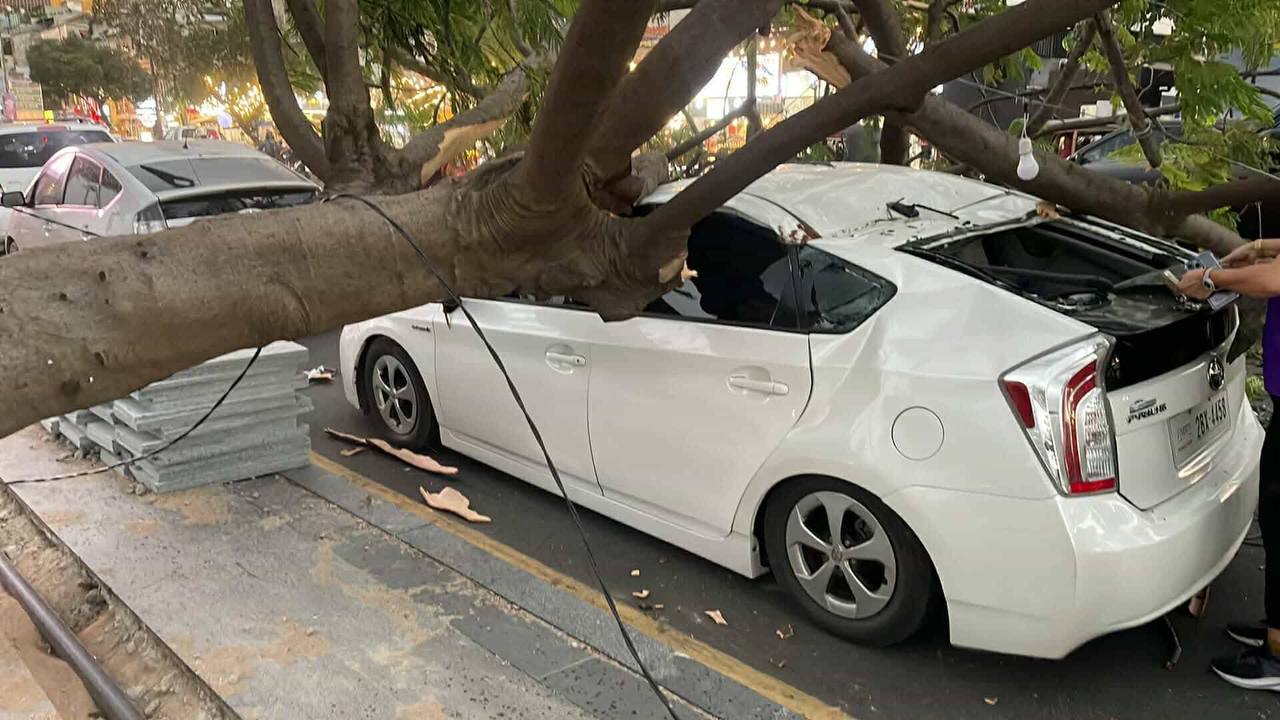 ខ្យល់កន្ត្រាក់ រលំដើមក្ងោកសង្កត់រថយន្តព្រូស១គ្រឿង នៅក្បែរសួននាគបាញ់ទឹកវិមានឯករាជ្យ