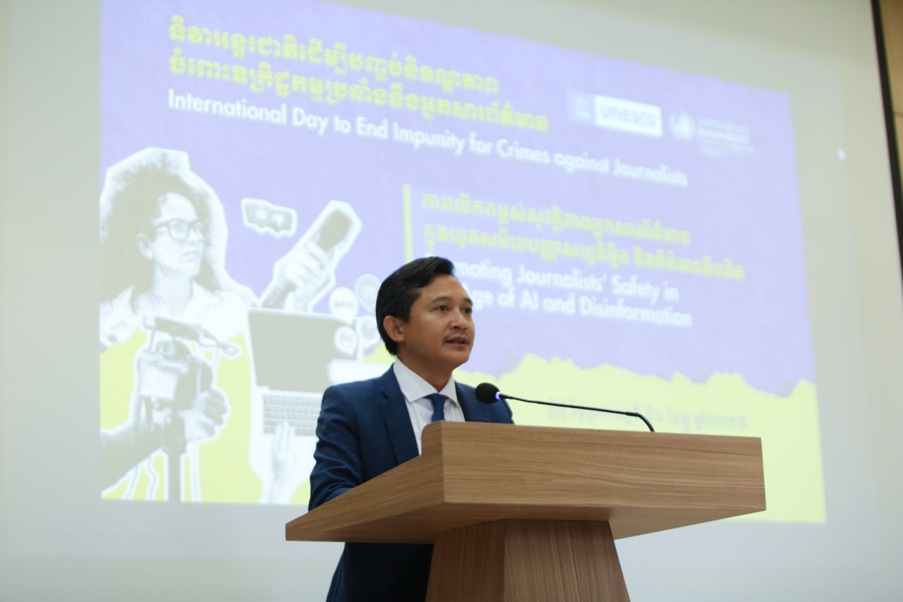 ការលើកឡើងរបស់ឯកឧត្ដម ទេព អស្នារិទ្ធ អនុរដ្ឋលេខាធិការ និងជាអ្នកនាំពាក្យក្រសួងព័ត៌មានបានអ្នកនាំពាក្យក្រសួងព័ត៌មានថ្លែងបែបនេះ ក្នុងឱកាសទិវាអន្តរជាតិបញ្ចប់វប្បធម៌និទណ្ឌភាពចំពោះឧក្រិដ្ឋកម្មប្រឆាំងនឹងអ្នកសារព័ត៌មានរៀបចំឡើងដោយការិយាល័យឧត្ដមស្នងការអង្គការសហប្រជាជាតិទទួលបន្ទុកសិទ្ធិមនុស្ស (OHCHR) និងអង្គការយូណេស្កូ (UNESCO) នារសៀលថ្ងៃទី៤ ខែធ្នូ ឆ្នាំ២០២៥ នៅរាជធានីភ្នំពេញ។ ឯកឧត្ដម ទេព អស្នារិទ្ធ បានគូសបញ្ជាក់ជូនអ្នកចូលរួមទាំងអស់ថា កម្ពុជាប្រឆាំងនិទណ្ឌភាព ហើយបន្តលើកកម្ពស់យុត្តិធម៌ និងសុវត្ថិភាពសម្រាប់ការអនុវត្តសកម្មភាពក្នុងវិជ្ជាជីវៈសារព័ត៌មាន ។