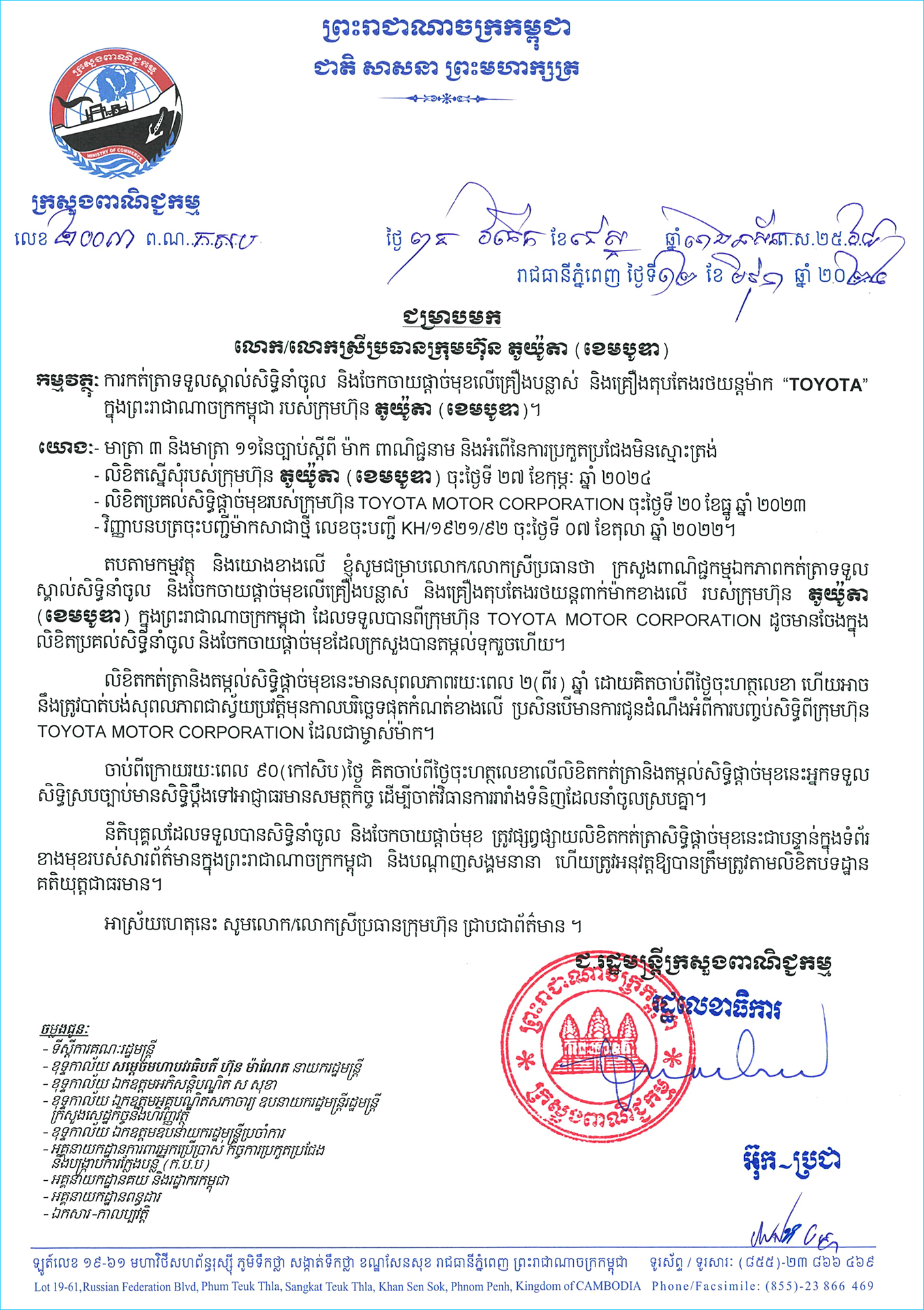 ជាមួយគ្នានេះផងដែរ ក្រុមហ៊ុន តូយ៉ូតា (ខេមបូឌា) TOYOTA (CAMBODIA) CO., LTD. មានសិទ្ធិស្របច្បាប់ក្នុងការដាក់ពាក្យបណ្តឹងទៅកាន់អាជ្ញាធរមានសមត្ថកិច្ចដើម្បីចាត់វិធានការទៅលើការនាំចូល និងចែកចាយផលិតផលដែលពាក់ម៉ាកដូចគ្នាទៅនឹងម៉ាករបស់ក្រុមហ៊ុនដូចដែលមានចែងក្នុងលិខិតទទួលសិទ្ធិនេះផងដែរ។ អាស្រ័យដូចបានជម្រាបជូនខាងលើ សូមសាធារណជនមេត្តាជ្រាប។ ខាងក្រោមនេះគឺជាលិខិតថតចម្លងចេញដោយក្រសួងពាណិជ្ជកម្ម ៕ អត្ថបទសហការ