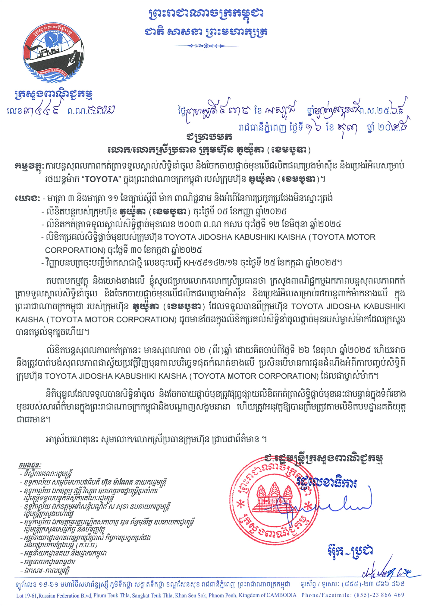 រាជធានីភ្នំពេញ ៖ ដោយយោងតាមមាត្រា ៣ និងមាត្រា ១១ នៃច្បាប់ស្តីពី ម៉ាក ពាណិជ្ជនាម និងអំពីការប្រកួតប្រជែងមិនស្មោះត្រង់ ក្រសួងពាណិជ្ជកម្ម នៃព្រះរាជាណាចក្រកម្ពុជា បានឯកភាពបន្តសុពលភាពកត់ត្រាទទួលស្គាល់សិទ្ធិនាំចូល និងចែកចាយផ្តាច់មុខលើផលិតផលប្រេងម៉ាស៊ីន និងប្រេងរំអិលសម្រាប់រថយន្ត ម៉ាក “TOYOTA” របស់ក្រុមហ៊ុន TOYOTA (CAMBODIA) CO., LTD. ដែលទទួលបានពីក្រុមហ៊ុន TOYOTA MOTOR CORPORATION ដែលមានលិខិតប្រគល់សិទ្ធិផ្តាច់មុខ ចុះថ្ងៃទី ៣០ ខែកក្កដា ឆ្នាំ ២០២៥ តាមរយៈលិខិតប្រកាសលេខ ៣៤៤៩ ព.ណ កសប ចុះថ្ងៃទី ១៦ ខែតុលា ឆ្នាំ ២០២៥ ។