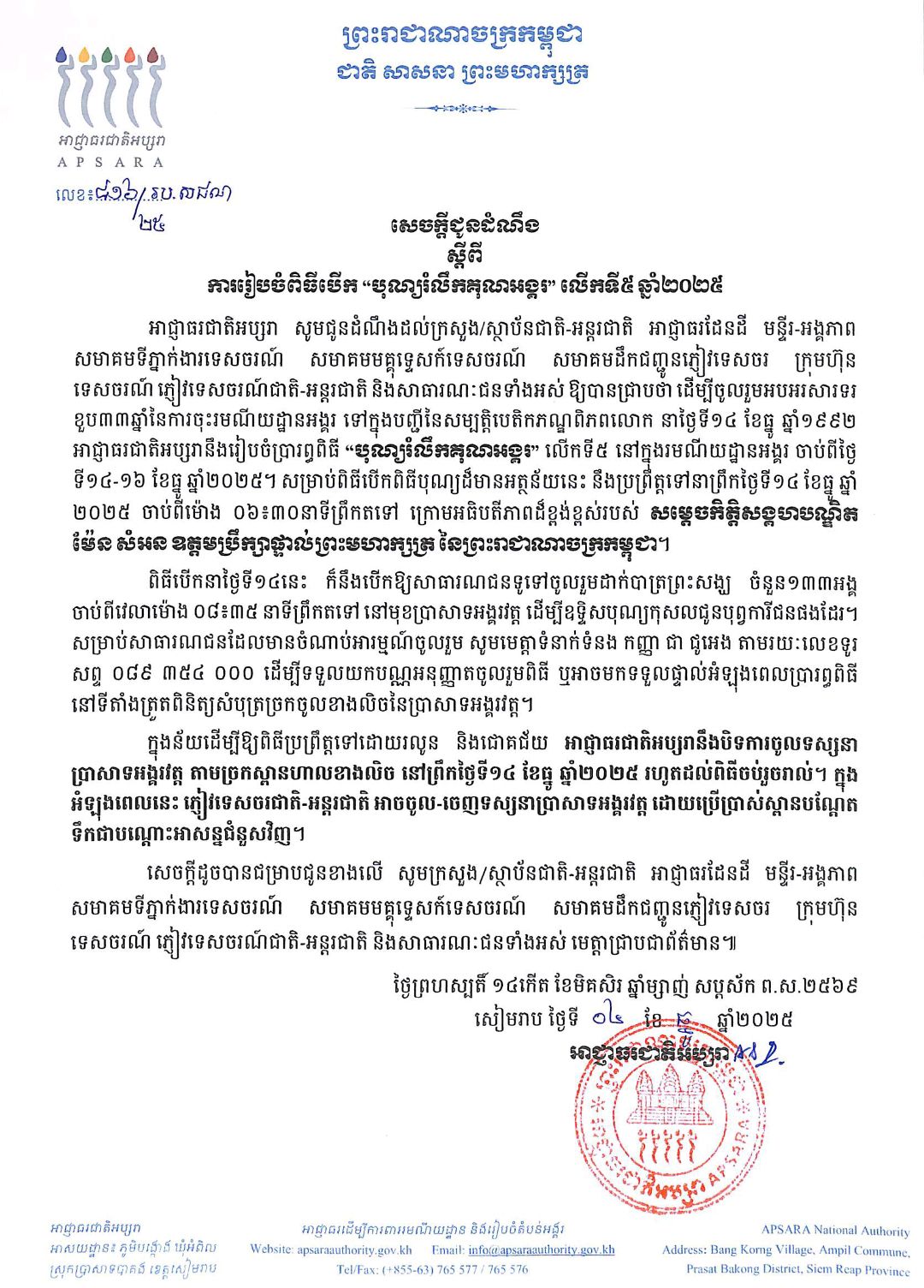 ក្នុងន័យដើម្បីឱ្យពិធីប្រព្រឹត្តទៅដោយរលូន និងជោគជ័យអាជ្ញាធរជាតិអប្សរា នឹងបិទការចូលទស្សនាប្រាសាទអង្គរវត្តតាមច្រកស្ពានហាលខាងលិចនៅព្រឹកថ្ងៃទី ១៤ ខែធ្នូ ឆ្នាំ ២០២៥ រហូតដល់ពិធីចប់រួចរាល់ ។