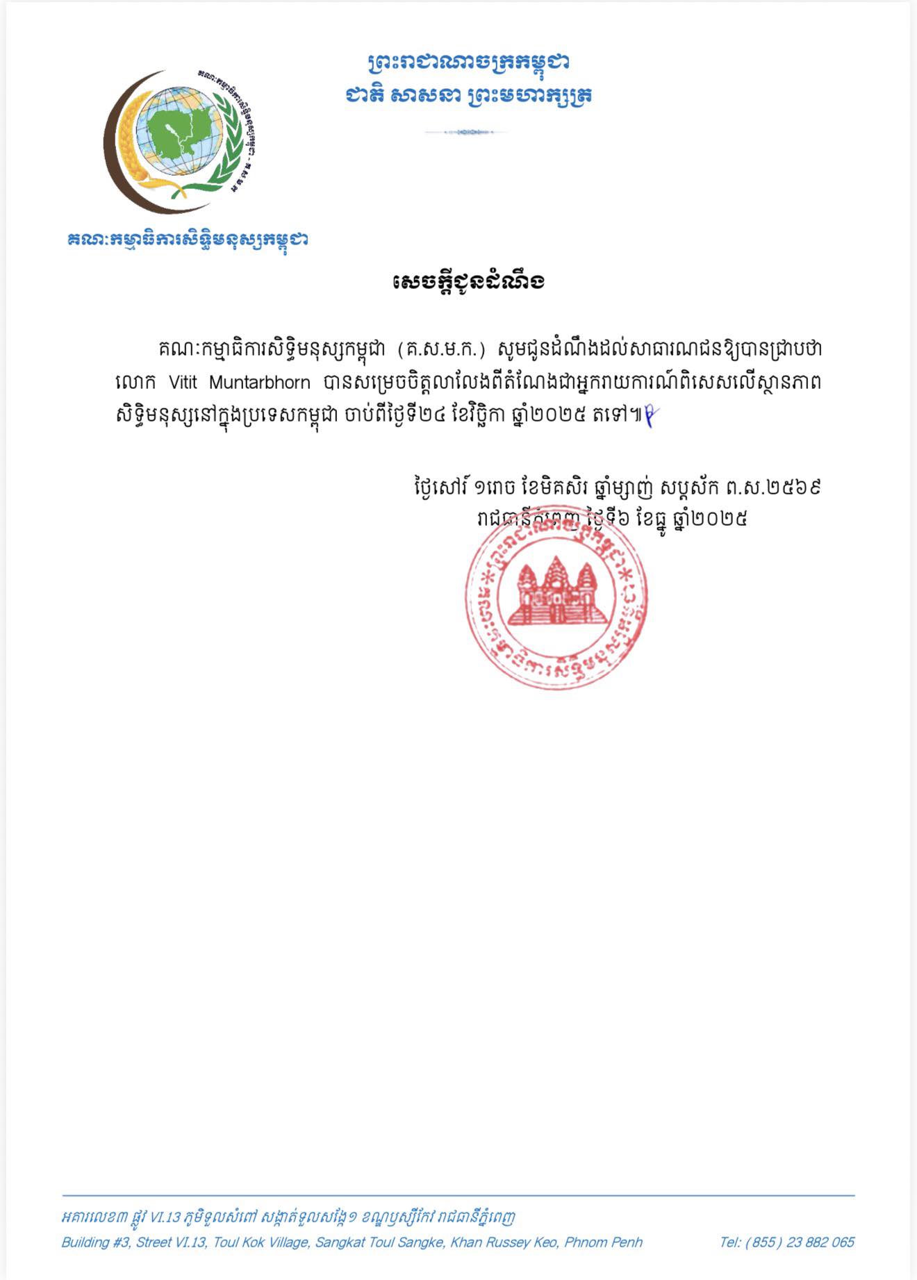 រាជធានីភ្នំពេញ ៖ យោងតាម Facebook ឯកឧត្តម កែវ រ៉េមី ទេសរដ្ឋមន្ត្រី និងជាប្រធានគណៈកម្មាធិការសិទ្ធិមនុស្សកម្ពុជា នៅថ្ងៃទី ៦ ខែធ្នូ ឆ្នាំ ២០២៥ នេះបានសរសេរថា កាលពីថ្ងៃទី ១០ ខែវិច្ឆិកា នៅពេលដែលខ្ញុំបានជួបសន្ទនាជាមួយ លោក Rory Mungoven អ្នកទទួលបន្ទុកសិទ្ធិមនុស្សនៅអាស៊ីប៉ាស៊ីហ្វិក ។ ខ្ញុំបានប្រាប់គាត់ថា ៖ ក្នុងពេលនៃការយារយី និងរំលោភសិទ្ធិមនុស្ស និងច្បាប់អន្តរជាតិយ៉ាងធ្ងន់ធ្ងរពីកងទ័ពថៃ រាល់លិខិតបណ្តឹងដែលបានផ្ញើចេញទៅគ្រប់ស្ថាប័នពាក់ព័ន្ធនឹងសិទ្ធិមនុស្សទាំងអស់លើកលែងតែលោក វិទីត មួយគត់ដែលខ្ញុំមិនបានផ្ញើទៅគាត់ ។