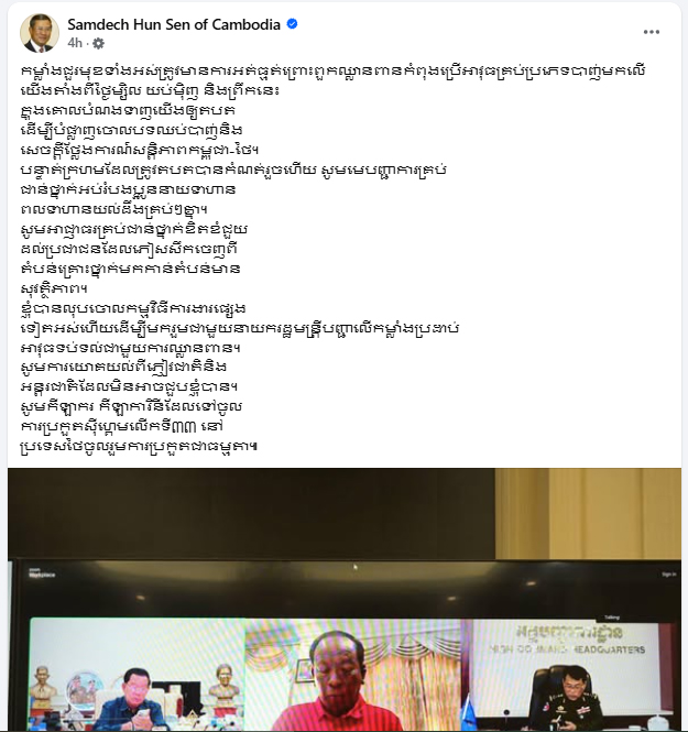 បន្ទាត់ក្រហមដែលត្រូវតបតបានកំណត់រួចហើយ សូមមេបញ្ជាការគ្រប់ជាន់ថ្នាក់អប់រំបងប្អូននាយទាហានពលទាហានយល់ដឹងគ្រប់ៗគ្នា។ សូមអាជ្ញាធរគ្រប់ជាន់ថ្នាក់ខិតខំជួយដល់ប្រជាជនដែលភៀសសឹកចេញពីតំបន់គ្រោះថ្នាក់មកកាន់តំបន់មានសុវត្តិភាព ។ ខ្ញុំបានលុបចោលកម្មវិធីការងារផ្សេងទៀតអស់ហើយ ដើម្បីមករួមជាមួយនាយករដ្ឋមន្ត្រីបញ្ជាលើកម្លាំងប្រដាប់អាវុធទប់ទល់ជាមួយការឈ្លានពាន ។ សូមការយោគយល់ពីភ្ញៀវជាតិ និងអន្តរជាតិដែលមិនអាចជួបខ្ញុំបាន»។