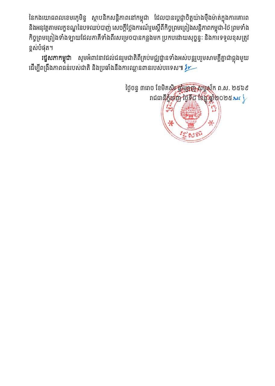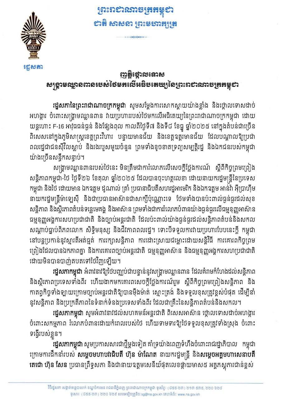 រដ្ឋសភានៃព្រះរាជាណាចក្រកម្ពុជា បានប្រកាសនាថ្ងៃទី៨ ខែធ្នូនេះថា ៖ សូមសំដែងនូវការសោកស្តាយជាខ្លាំង និងថ្កោលទោសដាច់អង្ហាការចំពោះសង្គ្រាមឈ្លានពានវាយប្រហាររបស់ថៃមកលើអធិបតេយ្យនៃព្រះរាជាណាចក្រកម្ពុជាដោយយន្តហោះ F-16 អាវុធធន់ធ្ងន់ និងផ្សែងពុល ។