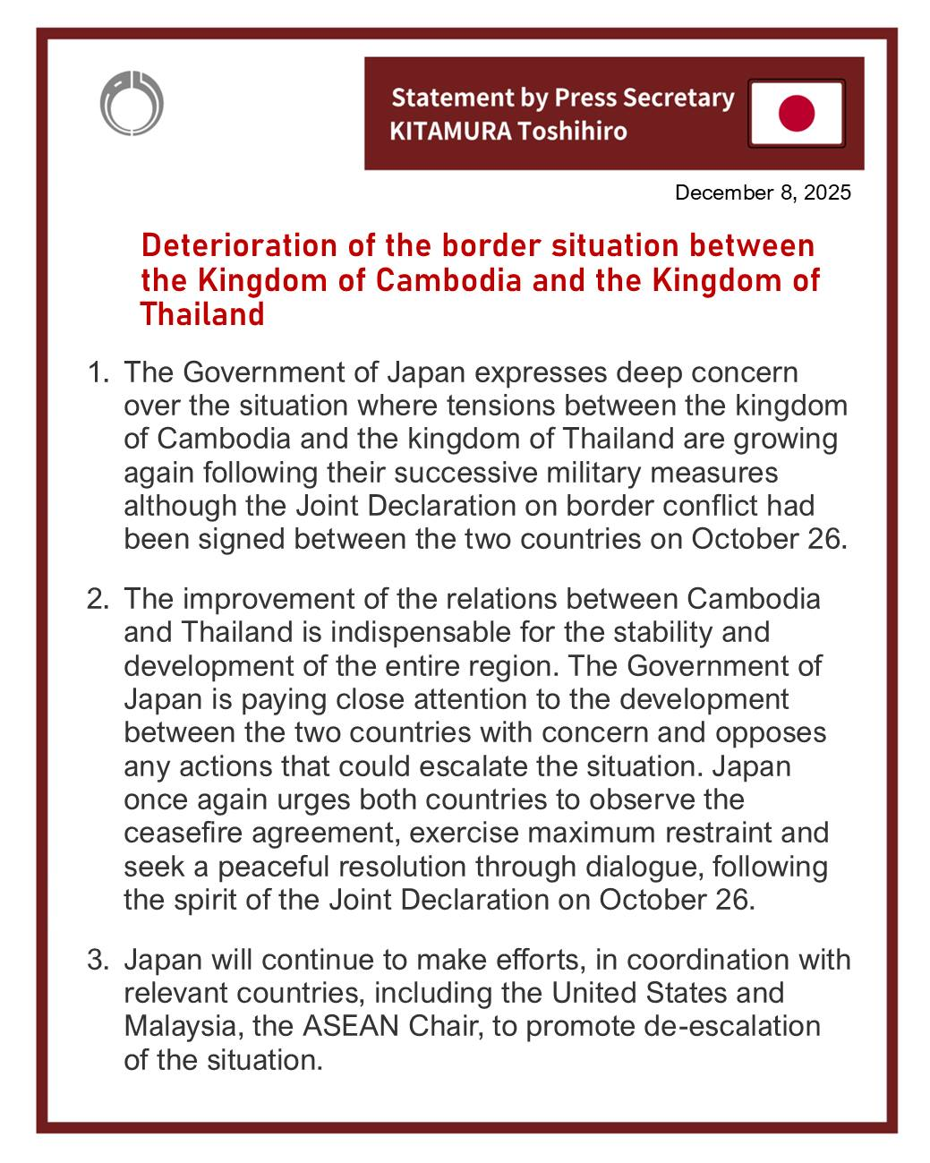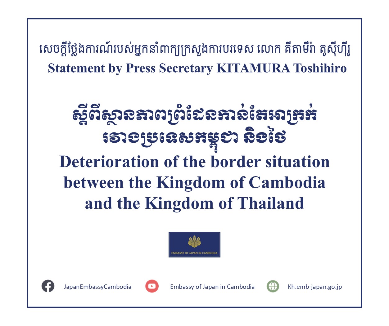 រាជធានីភ្នំពេញ ៖ ទំព័រហ្វេសប៊ុកស្ថានទូតជប៉ុនប្រចាំកម្ពុជា នៅល្ងាចថ្ងៃទី០៨ ខែធ្នូ ឆ្នាំ២០២៥នេះ បានបង្ហោះសេចក្តីថ្លែងការណ៍របស់អ្នកនាំពាក្យក្រសួងការបរទេសជប៉ុន ស្តីពីស្ថានភាពព្រំដែនកាន់តែអាក្រក់រវាងប្រទេសកម្ពុជា និងថៃ ។