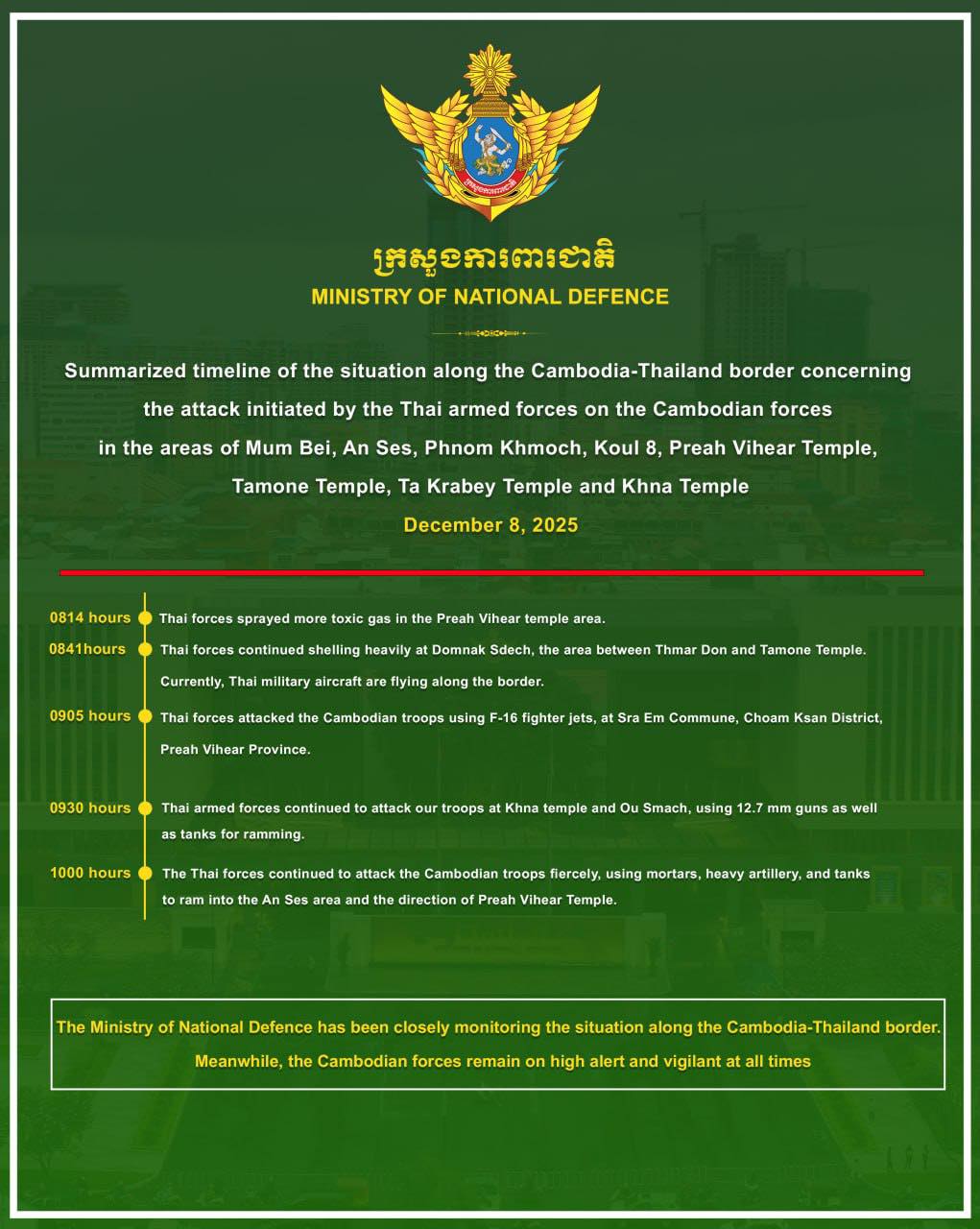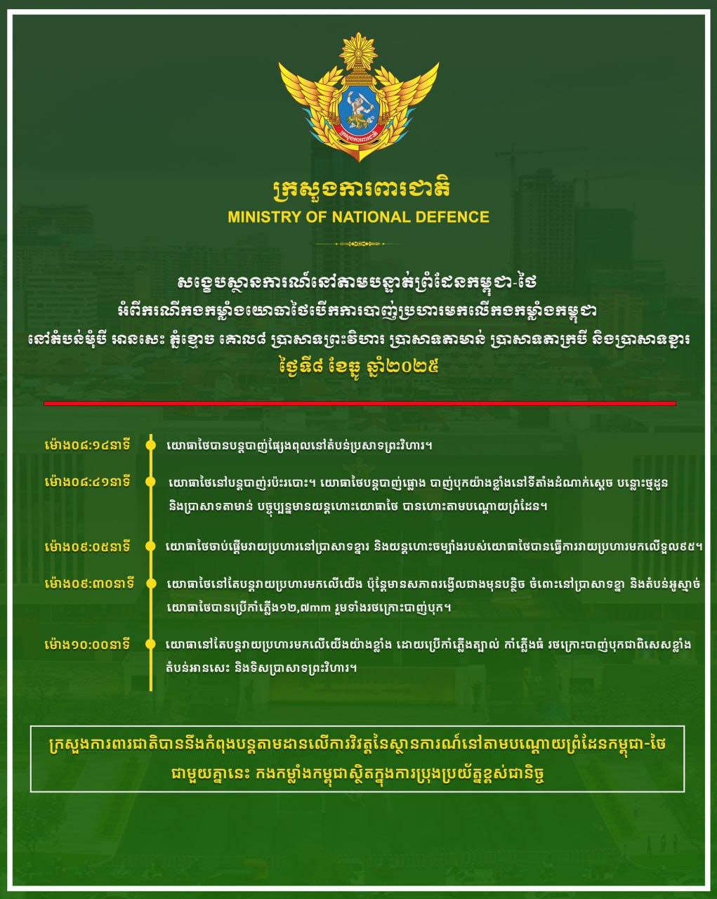 សង្ខេបស្ថានការណ៍ ថ្ងៃទី៨ ធ្នូនេះនៅតាមបន្ទាត់ព្រំដែន ករណីយោធាថៃបើកការបាញ់ប្រហារមកលើកងកម្លាំងកម្ពុជា