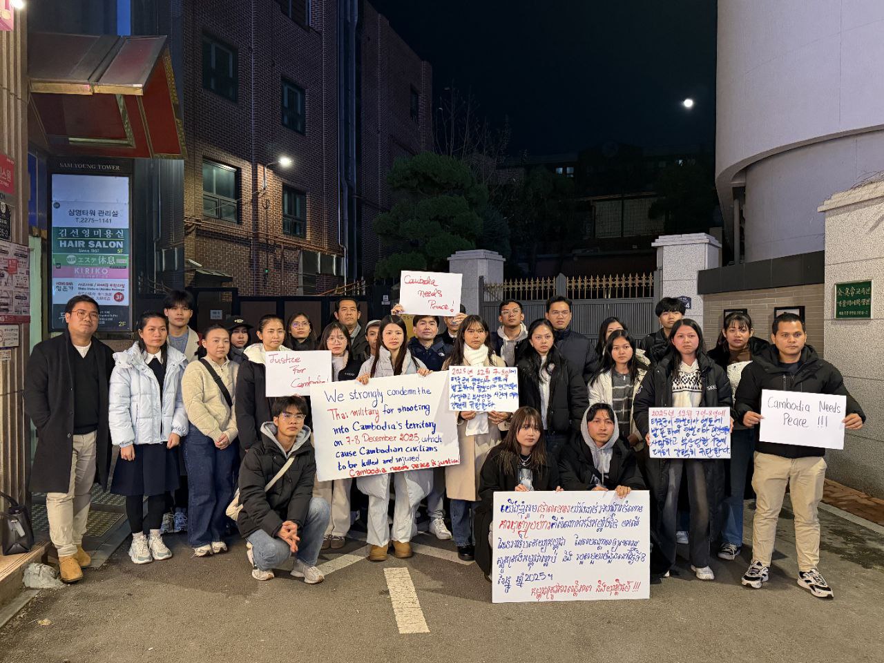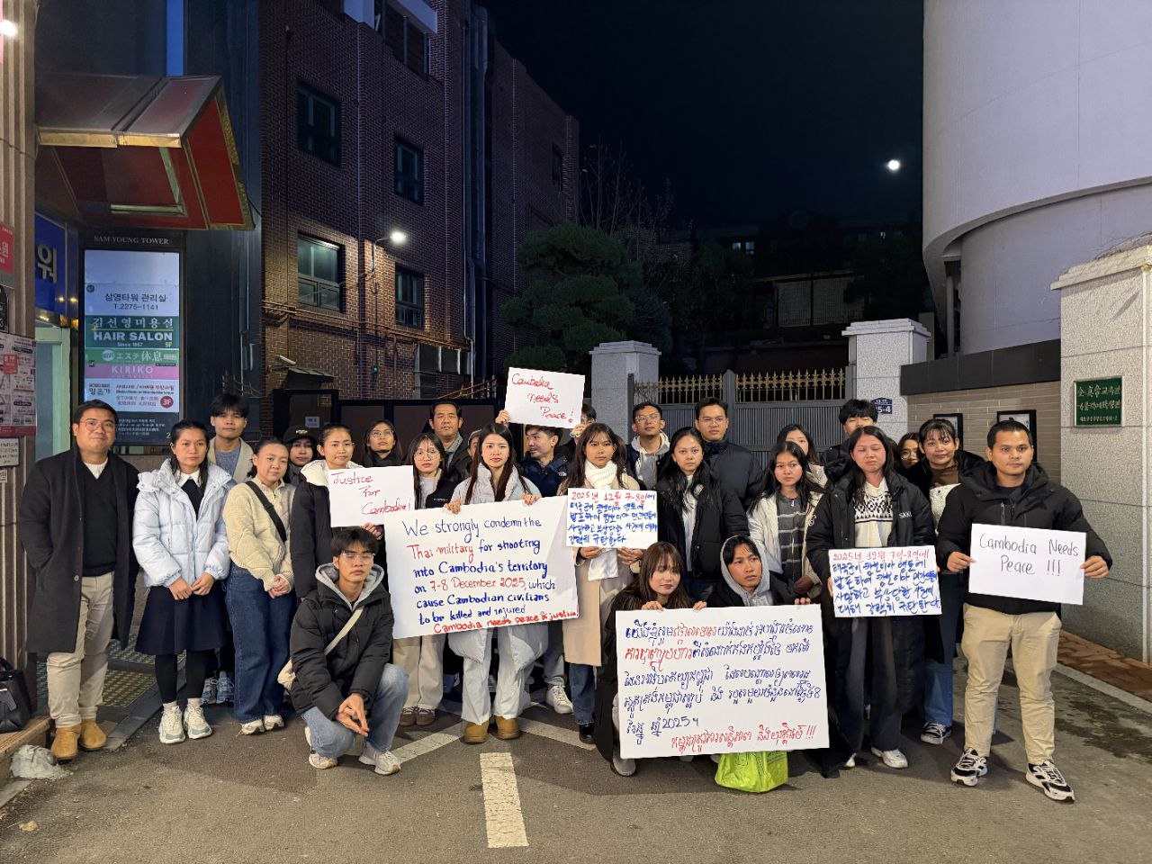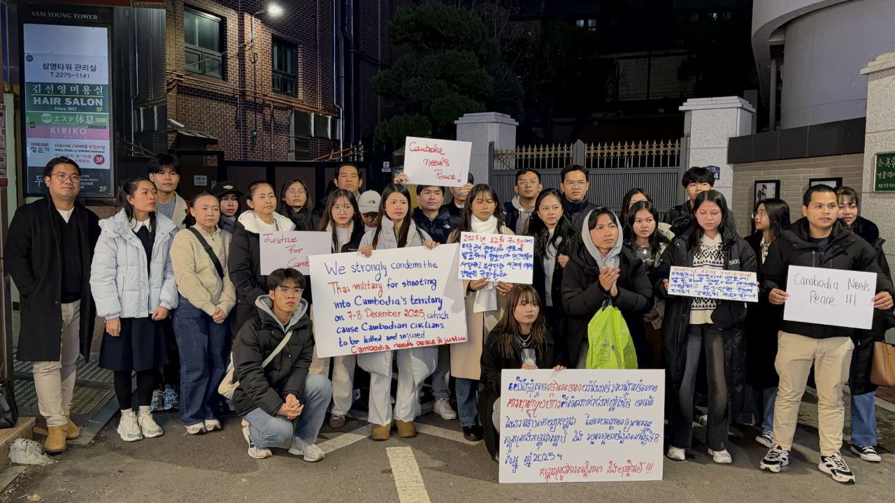 រាជធានីភ្នំពេញ ៖ ក្រុមនិស្សិតខ្មែរប្រមាណ ៤០នាក់ ដែលស្ថិតនៅក្នុងសមាគមនិស្សិតនៅសាធារណរដ្ឋកូរ៉េ បានជួបជុំគ្នានៅថ្ងៃទី៨ ខែធ្នូ ដោយបានថ្កោលទោសយ៉ាងដាច់អហង្ការ ចំពោះការបាញ់ប្រហារពីសំណាក់កងកម្លាំងថៃ មកលើដែនអធិបតេយ្យកម្ពុជា ដែលបានបណ្ដាលឱ្យប្រជាពលរដ្ឋស្លូតត្រង់កម្ពុជាស្លាប់ និងរបួសមួយចំនួន នៅថ្ងៃទី៨ ខែធ្នូ ឆ្នាំ២០២៥ ។