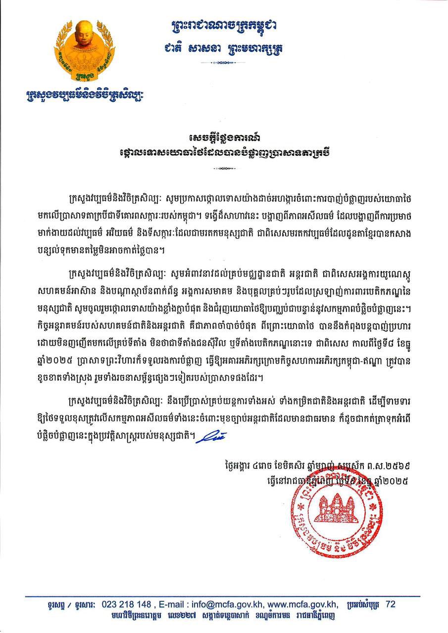 ជាក់ស្តែង ក្រសួងវប្បធម៌ និងវិចិត្រសិល្បៈ បានប្រកាសនារសៀលថ្ងៃទី៩ ខែធ្នូ ឆ្នាំ២០២៥នេះថា ៖ ក្រសួងវប្បធម៌ និងវិចិត្រសិល្បៈ សូមប្រកាសថ្កោលទោសយ៉ាងដាច់អហង្ការចំពោះការបាញ់បំផ្លាញរបស់យោធាថៃ មកលើប្រាសាទតាក្របី ជាទីគោរពសក្ការៈរបស់កម្ពុជា ។
