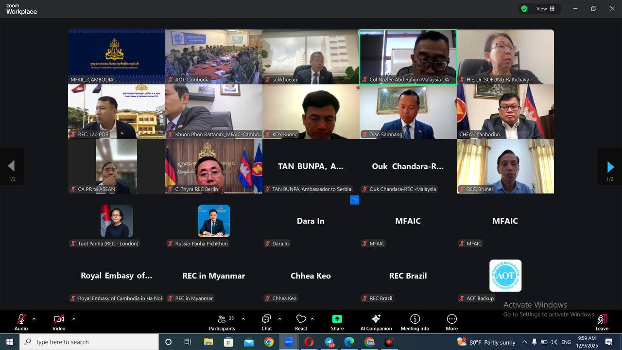 រាជធានីភ្នំពេញ ៖ ប្រភពក្រសួងការពារជាតិ បានឱ្យដឹងថា នៅព្រឹកថ្ងៃទី ០៩ ខែធ្នូ ឆ្នាំ ២០២៥នេះ ក្រសួងការបរទេស និងសហប្រតិបត្តិការអន្តរជាតិ បានបើកកិច្ចប្រជុំបន្ទាន់ជាមួយអង្គទូតបរទេសប្រចាំព្រះរាជាណាចក្រកម្ពុជាចំនួន ៣០ អង្គទូត និង ០៣ អង្គការអន្តរជាតិ ក្នុងនោះក៏មានតំណាងអង្គការសហប្រជាជាតិចូលរួមផងដែរ ដើម្បីធ្វើបទបង្ហាញអំពីស្ថានការណ៍នៅតាមបន្ទាត់ព្រំដែនកម្ពុជា-ថៃ ក្នុងយោធភូមិភាគទី ៤ និងយោធភូមិភាគទី ៥ ក្រោយយោធាថៃ បានបើកការវាយប្រហារឈ្លានពានមកលើកម្ពុជា ដែលសកម្មភាពនៃរំលោភបំពានលើ «បទឈប់បាញ់» និង «សេចក្តីថ្លែងការណ៍រួមស្តីពីកិច្ចព្រមព្រៀងសន្តិភាពរវាងកម្ពុជានិងថៃ» អស់រយៈពេល ៣ ថ្ងៃមកហើយ ចាប់តាំងពីថ្ងៃទី ០៧ ខែធ្នូ ឆ្នាំ ២០២៥ រហូតមកទល់ថ្ងៃនេះ ។