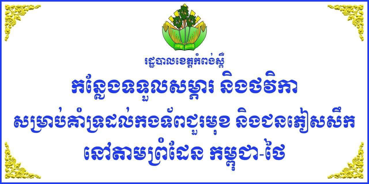 ខេត្តកំពង់ស្ពឺ ៖ រដ្ឋបាលខេត្តកំពង់ស្ពឺធ្វើការអំពាវនាវ និងជូនដំណឹងដល់សប្បុរសជននានា ដែលមានបំណងចង់បរិច្ចាគនូវសម្ភារៈ និងថវិកា សម្រាប់គាំទ្រដល់កងទ័ពជួរមុខ និងជនភៀសសឹក នៅតាមព្រំដែនកម្ពុជា-ថៃ ។