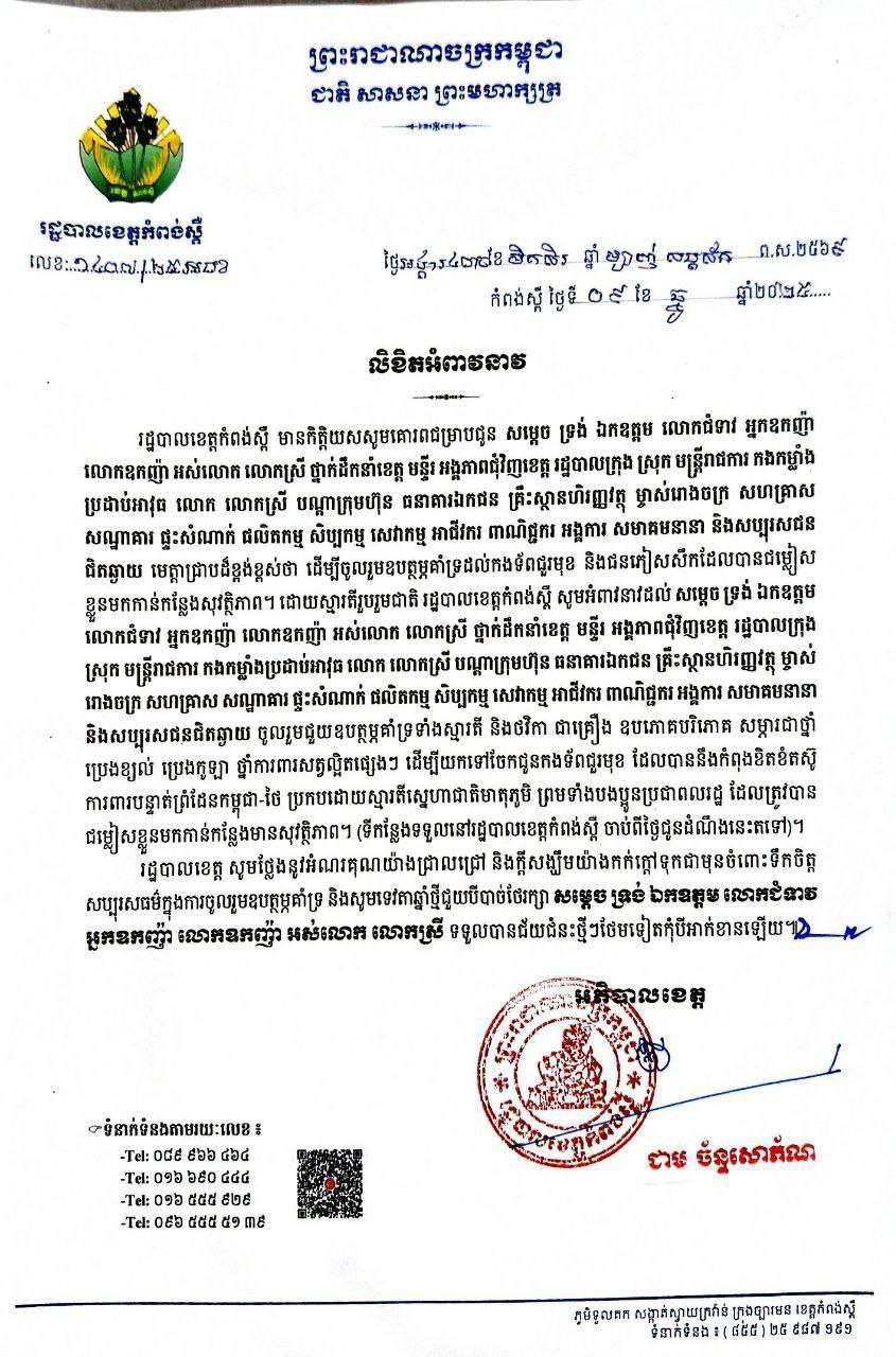 បើយោងតាមលិខិតអំពាវនាវរបស់រដ្ឋបាលខេត្តកំពង់ស្ពឺ នៅថ្ងៃទី៩ ខែធ្នូ ឆ្នាំ២០២៥នេះ!