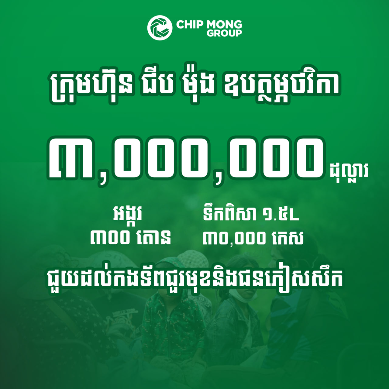 ក្រុមហ៊ុន ជីប ម៉ុង ដែលមានពហុពាណិជ្ជកម្មជាង ១៤ បានឧបត្ថម្ភទឹកប្រាក់ជាហូរហែ ដែលមកដល់បច្ចុប្បន្នសរុបជិត ៦ លានដុល្លារ រួមបញ្ចូលសម្ភារៈប្រើប្រាស់ចំបាច់ជូនដល់កងទ័ពជួរមុខនៅតាមបន្ទាត់ព្រំដែន ព្រមទាំងទឹកពិសាកម្ពុជា និងភេសជ្ជៈរាប់ម៉ឺនកេស ជូនដល់បងប្អូនភៀសសឹក និងកងទ័ពជួរមុខ ក្នុងកាលៈទេសៈលំបាក ដើម្បីជាតិ និងប្រជាជនខ្មែរ ។