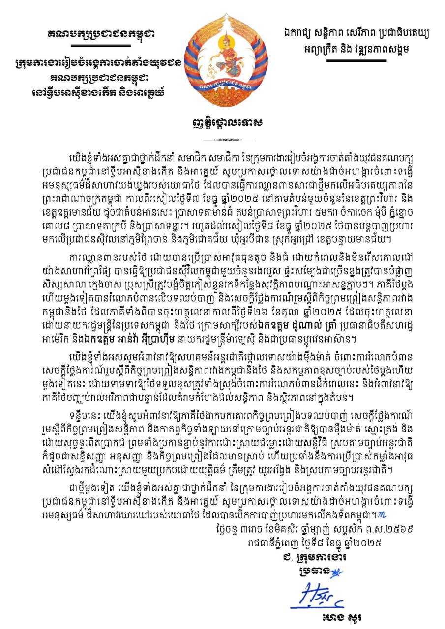 ក្រុមការងាររៀបចំអង្គការចាត់តាំង យុវជនគណបក្សប្រជាជនកម្ពុជា នៅទ្វីបអាស៊ីខាងកើត និងអាគ្នេយ៍ បានអំពាវនាវឱ្យសហគមន៍អន្តរជាតិ ថ្កោលទោសយ៉ាងម៉ឺងម៉ាត់ ចំពោះការរំលោភបំពានសេចក្ដីថ្លែងការណ៍រួម ស្ដីពីកិច្ចព្រមព្រៀងសន្តិភាព រវាងកម្ពុជានិងថៃ និងសកម្មភាពខុសច្បាប់របស់ថៃម្តងហើយម្តងទៀត ដោយទាមទារឱ្យថៃទទួលខុសត្រូវទាំងស្រុង ចំពោះការរំលោភបំពានដ៏កំរោលនេះ និងអំពាវនាវឱ្យភាគីថៃបញ្ឈប់រាល់ អរិភាពជាបន្ទាន់ ដែលគំរាមកំហែងដល់សន្តិភាព និងស្ថិរភាពនៅក្នុងតំបន់ ។