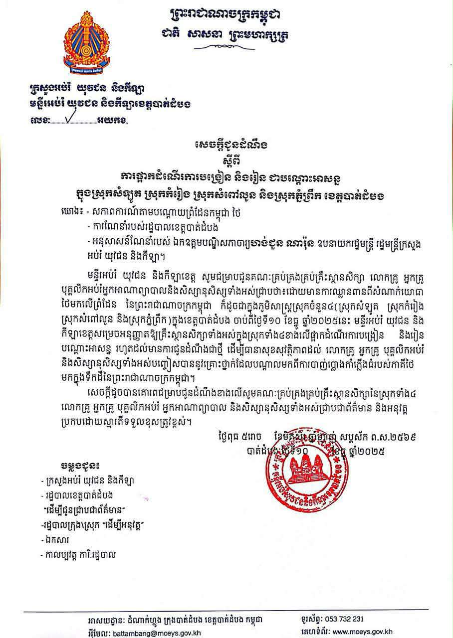 មន្ទីរអប់រំ យុវជន និងកីឡាខេត្ត បានជម្រាបជូនគណៈគ្រប់គ្រងគ្រប់គ្រឹះស្ថានសិក្សា លោកគ្រូ អ្នកគ្រូ បុគ្គលិកអប់រំអ្នកអាណាព្យាបាល និងសិស្សានុសិស្សទាំងអស់ជ្រាបថា ដោយមានការឈ្លានពានពីសំណាក់យោធាថៃមកលើព្រំដែន នៃព្រះរាជាណាចក្រកម្ពុជា ក៏ដូចជា ក្នុងភូមិសាស្ត្រស្រុកចំនួន៤ (ស្រុកសំឡូត ស្រុកកំរៀង ស្រុកសំពៅលូន និងស្រុកភ្នំព្រឹក) ក្នុងខេត្តបាត់ ដំបង ចាប់ពីថ្ងៃទី១០ ខែធ្នូ ឆ្នាំ២០២៥នេះ មន្ទីរអប់រំ យុវជន និងកីឡាខេត្ត សម្រេចអនុញ្ញាតឱ្យគ្រឹះស្ថានសិក្សាទាំងអស់ក្នុងស្រុកទាំង៤ខាងលើ ផ្អាកដំណើរការបង្រៀន និងរៀនបណ្តោះ អាសន្ន រហូតដល់មានការជូនដំណឹងជាថ្មី ។