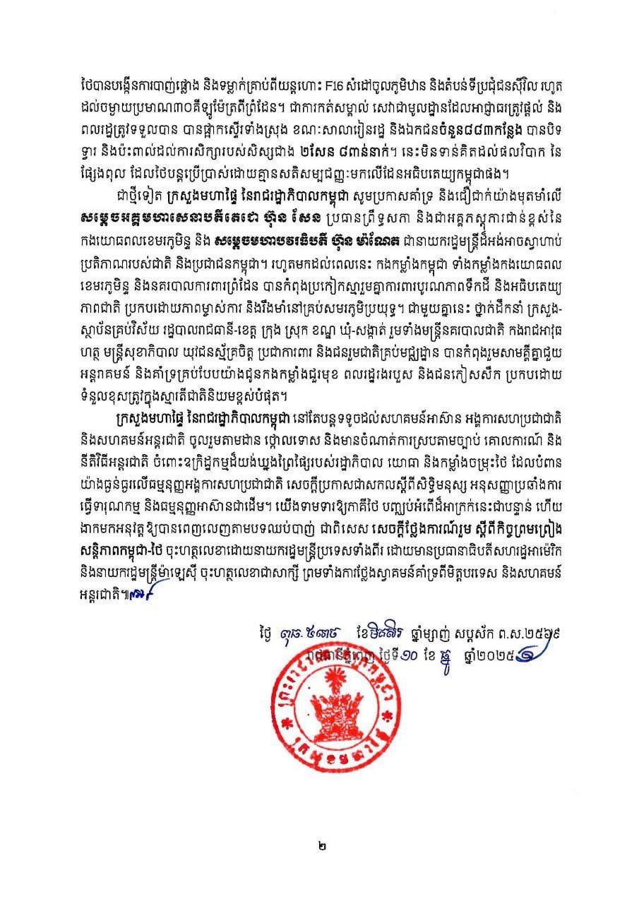 ជាថ្មីទៀត ក្រសួងមហាផ្ទៃ នៃរាជរដ្ឋាភិបាលកម្ពុជា សូមប្រកាសគាំទ្រ និងជឿជាក់យ៉ាងមុតមាំលើសម្តេចអគ្គមហាសេនាបតីតេជោ ហ៊ុន សែន ប្រធានព្រឹទ្ធសភា និងជាអគ្គភស្ដុភារជាន់ខ្ពស់នៃកងយោធពលខេមរភូមិន្ទ និងសម្តេចមហាបវរធិបតី ប៊ុន ម៉ាណែត ជានាយករដ្ឋមន្ត្រីដ៏អង់អាចស្វាហាប់ ប្រតិភាណរបស់ជាតិ និងប្រជាជនកម្ពុជា។ រហូតមកដល់ពេលនេះ កងកម្លាំងកម្ពុជា ទាំងកម្លាំងកងយោធពលខេមរភូមិន្ទ និងនគរបាលការពារព្រំដែន បានកំពុងប្រកៀកស្មារួមគ្នា ការពារបូរណភាពទឹកដី និងអធិបតេយ្យភាពជាតិ ប្រកបដោយភាពម្ចាស់ការ និងរឹងមាំនៅគ្រប់សមរភូមិប្រយុទ្ធ។ ជាមួយគ្នានេះ ថ្នាក់ដឹកនាំ ក្រសួង- ស្ថាប័នគ្រប់វិស័យ រដ្ឋបាលរាជធានី-ខេត្ត ក្រុង ស្រុក ខណ្ឌ ឃុំ-សង្កាត់ រួមទាំងមន្ត្រីនគរបាលជាតិ កងរាជអាវុធហត្ថ មន្ត្រីសុខាភិបាល យុវជនស្ម័គ្រចិត្ត ប្រជាការពារ និងជនរួមជាតិគ្រប់មជ្ឈដ្ឋាន បានកំពុងរួមសាមគ្គីគ្នាជួយអន្តរាគមន៍ និងគាំទ្រគ្រប់បែបយ៉ាងជូនកងកម្លាំងជួរមុខ ពលរដ្ឋរងរបួស និងជនភៀសសឹក ប្រកបដោយទំនួលខុសត្រូវក្នុងស្មារតីជាតិនិយមខ្ពស់បំផុត ។