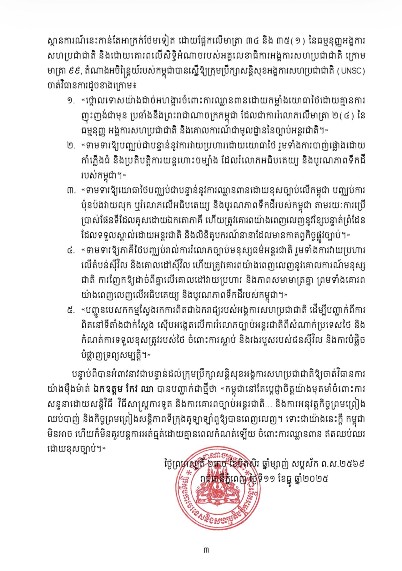 ៣. «ទាមទារឱ្យយោធាថៃបញ្ឈប់ជាបន្ទាន់នូវការឈ្លានពានដោយខុសច្បាប់លើកម្ពុជា បញ្ឈប់ការ ប៉ុនប៉ងវាយលុក ឬរំលោភលើអធិបតេយ្យ និងបូរណភាពទឹកដីរបស់កម្ពុជា តាមរយៈការប្រើ ប្រាស់ផែនទីដែលគូសដោយឯកតោភាគី ហើយត្រូវគោរពយ៉ាងពេញលេញនូវខ្សែបន្ទាត់ព្រំដែន ដែលទទួលស្គាល់ដោយអន្តរជាតិ និងលិខិតូបករណ៍នានាដែលមានកាតព្វកិច្ចផ្លូវច្បាប់»។