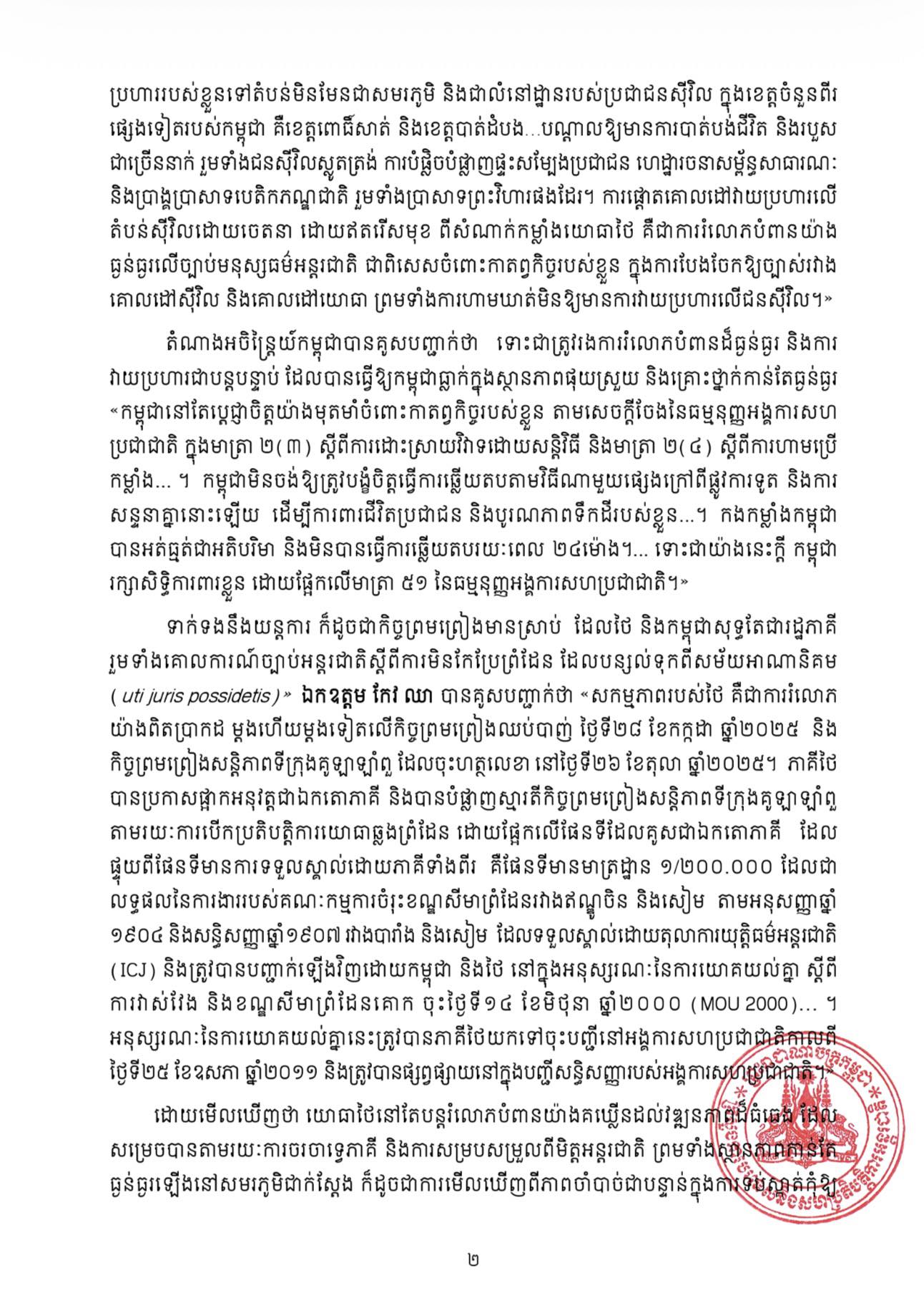 ២. “ទាមទារឱ្យបញ្ឈប់ជាបន្ទាន់នូវការវាយប្រហារដោយយោធាថៃ រួមទាំងការបាញ់ផ្លោងដោយ កាំភ្លើងធំ និងប្រតិបត្តិការយន្តហោះចម្បាំង ដែលរំលោភអធិបតេយ្យ និងបូរណភាពទឹកដី របស់កម្ពុជា។