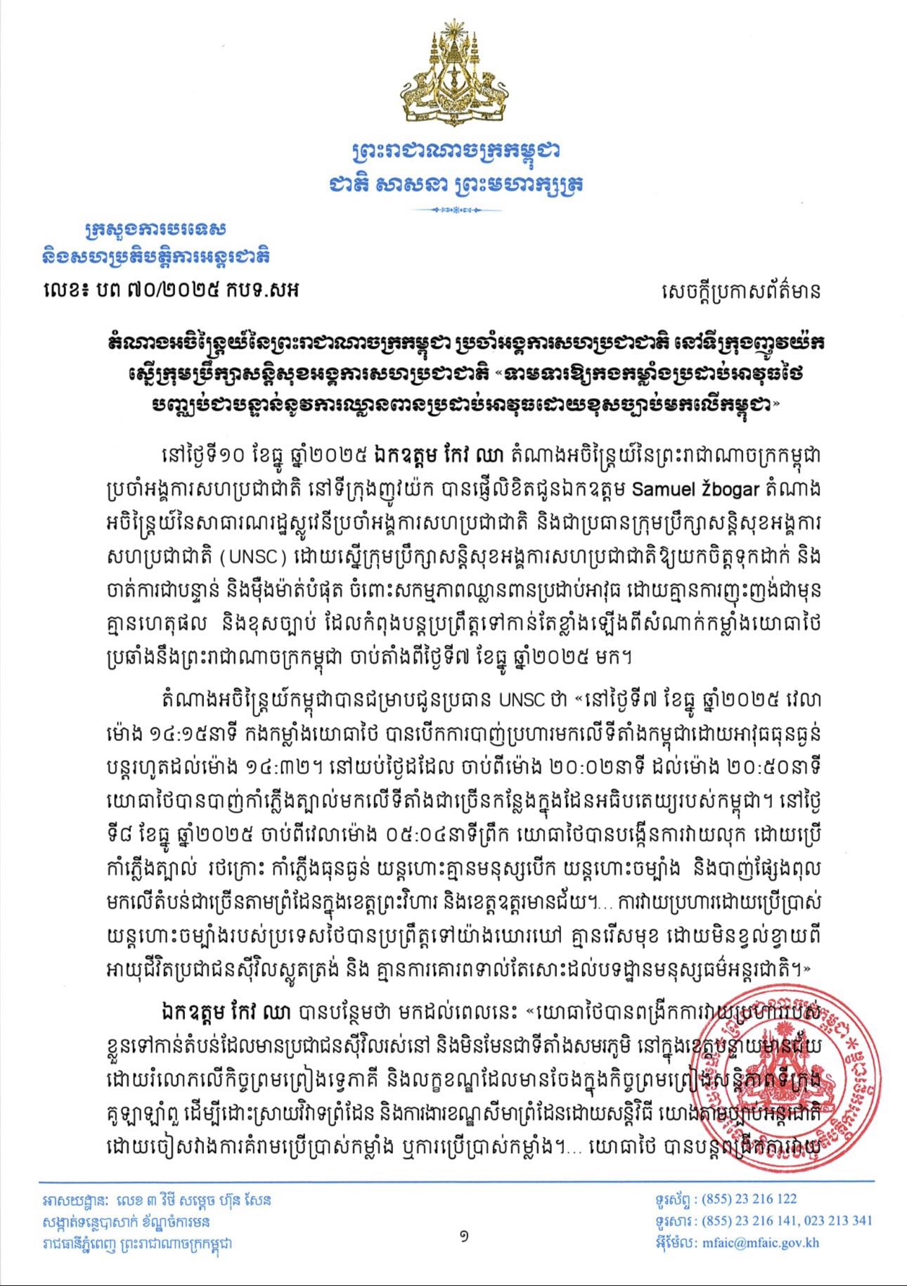 នៅថ្ងៃទី១០ ខែធ្នូ ឆ្នាំ២០២៥ ឯកឧត្តម កែវ ឈា តំណាងអចិន្ត្រៃយ៍នៃព្រះរាជាណាចក្រកម្ពុជា ប្រចាំអង្គការសហប្រជាជាតិ នៅទីក្រុងញូវយ៉ក បានផ្ញើលិខិតជូនឯកឧត្តម Samuel Žbogar តំណាង អចិន្ត្រៃយ៍នៃសាធារណរដ្ឋស្លូវេនីប្រចាំអង្គការសហប្រជាជាតិ និងជាប្រធានក្រុមប្រឹក្សាសន្តិសុខអង្គការ សហប្រជាជាតិ (UNSC) ដោយស្នើក្រុមប្រឹក្សាសន្តិសុខអង្គការសហប្រជាជាតិឱ្យយកចិត្តទុកដាក់ និង ចាត់ការជាបន្ទាន់ និងម៉ឺងម៉ាត់បំផុត ចំពោះសកម្មភាពឈ្លានពានប្រដាប់អាវុធ ដោយគ្មានការញុះញង់ជាមុន គ្មានហេតុផល និងខុសច្បាប់ ដែលកំពុងបន្តប្រព្រឹត្តទៅកាន់តែខ្លាំងឡើងពីសំណាក់កម្លាំងយោធាថៃ ប្រឆាំងនឹងព្រះរាជាណាចក្រកម្ពុជា ចាប់តាំងពីថ្ងៃទី៧ ខែធ្នូ ឆ្នាំ២០២៥ មក ។