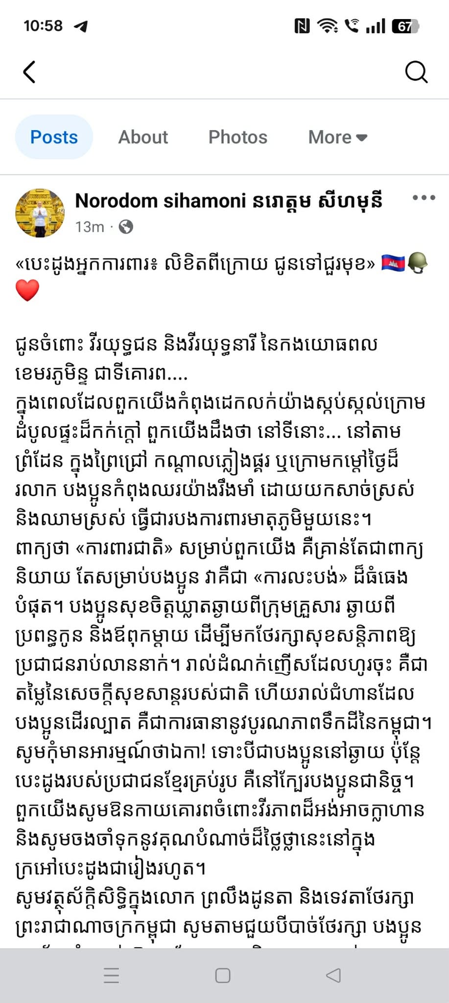 រាជធានីភ្នំពេញ ៖ លិខិតមួយច្បាប់ត្រូវបានម្ចាស់គណនេយហ្វេសមានឈ្មោះ«Norodom sihamoni(នរោត្តម សីហមុនី)» បានសរសេរលិខិតមួយច្បាប់មានអត្ថន័យយ៉ាងដូច្នេះ៖ ជូនចំពោះ វីរយុទ្ធជន និងវីរយុទ្ធនារី នៃកងយោធពលខេមរភូមិន្ទ ជាទីគោរព…. ក្នុងពេលដែលពួកយើងកំពុងដេកលក់យ៉ាងស្កប់ស្កល់ក្រោមដំបូលផ្ទះដ៏កក់ក្តៅ ពួកយើងដឹងថា នៅទីនោះ… នៅតាមព្រំដែនក្នុងព្រៃជ្រៅកណ្តាលភ្លៀងផ្គរ ឬក្រោមកម្ដៅថ្ងៃដ៏រលាក បងប្អូនកំពុងឈរយ៉ាងរឹងមាំ ដោយយកសាច់ស្រស់ និងឈាមស្រស់ ធ្វើជារបងការពារមាតុភូមិមួយនេះ ។